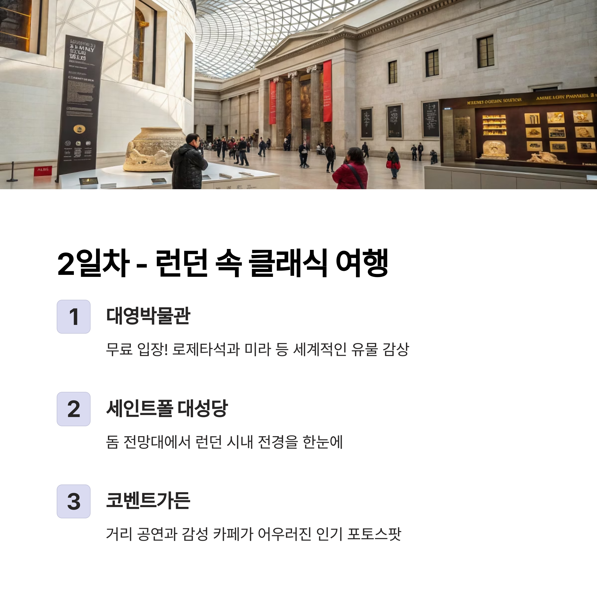 추천 장소: 대영박물관, 세인트폴 대성당, 코벤트가든