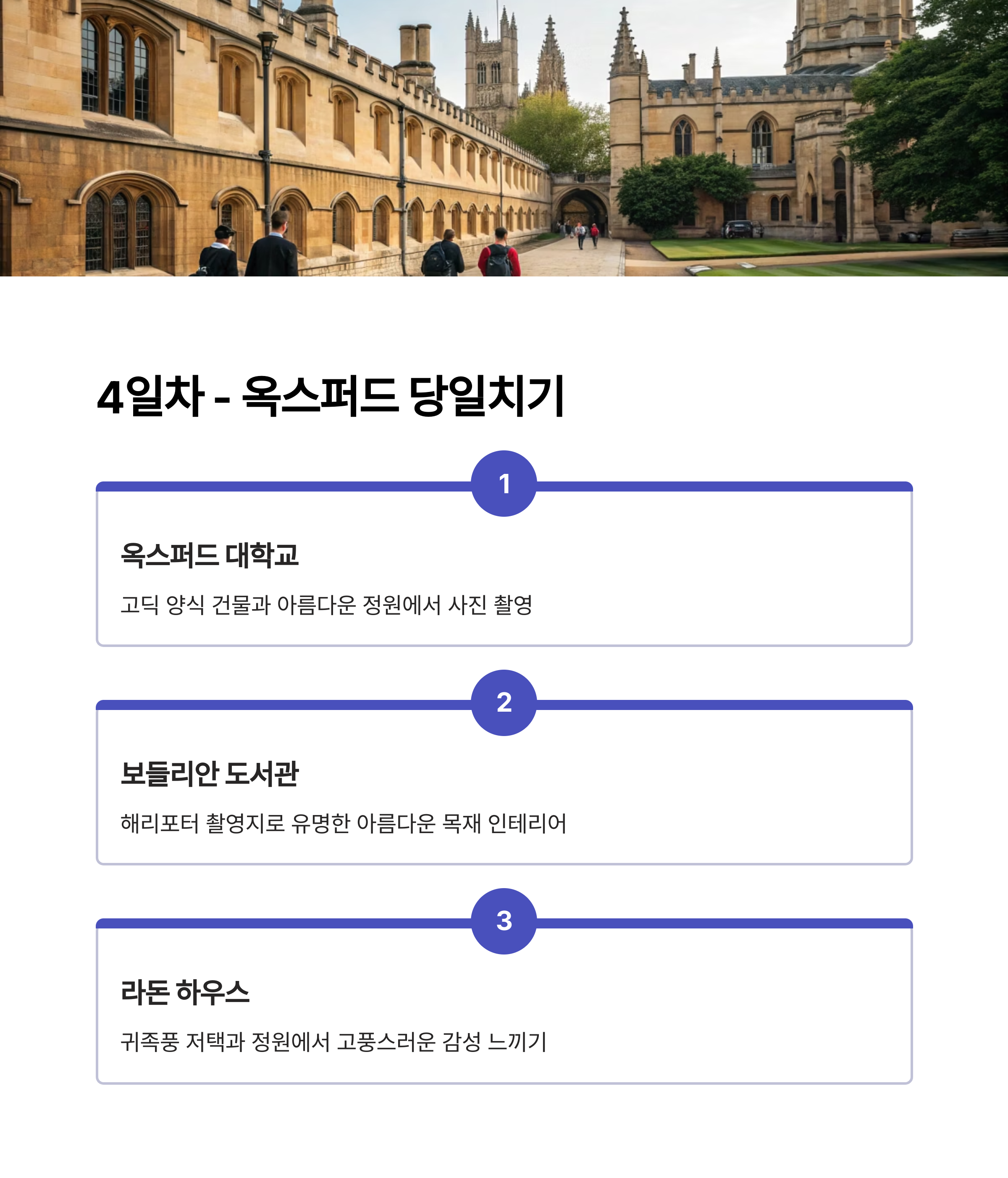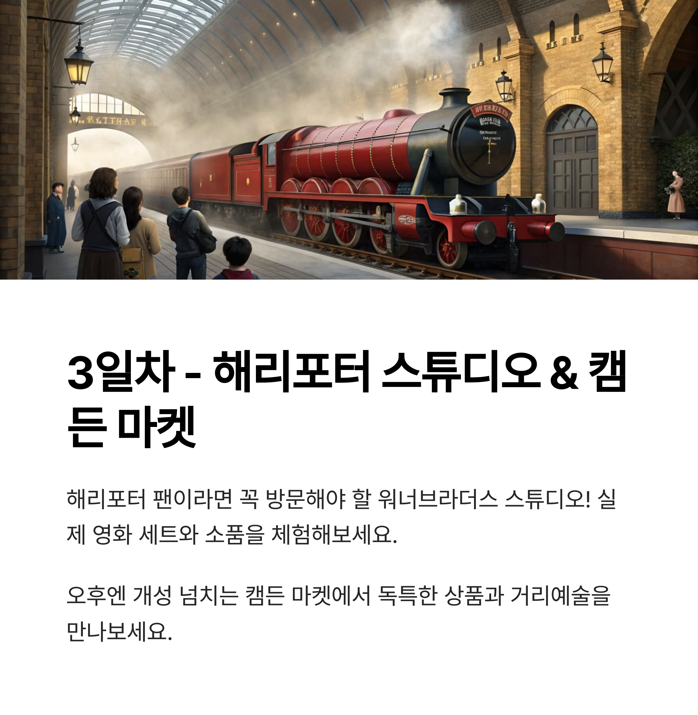 1일차 런던 버킹엄 궁전, 런던아이 도보 & 지하철 2일차 런던 대영박물관, 코벤트가든 도보 & 지하철 3일차 런던 해리포터 스튜디오, 캠든 기차 + 도보 4일차 옥스퍼드 대학가 탐방 기차 당일치기 5일차 코츠월드 감성 마을 여행 차량 이동 6일차 리버풀 비틀즈 뮤지엄 기차 왕복 7일차 런던 쇼핑, 마켓 탐방 도보 & 지하철