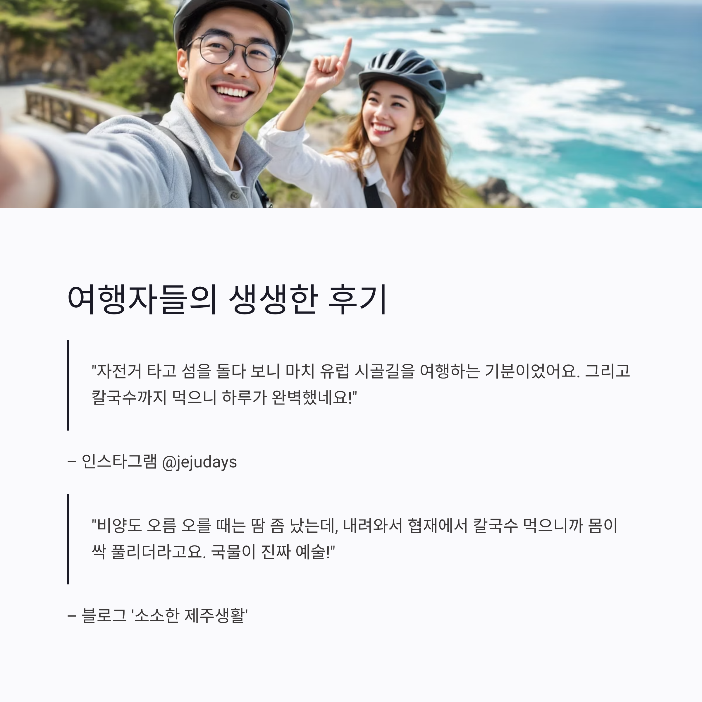 몸이 싹 풀리더라고요. 국물이 진짜 예술!" – 블로그 ‘소소한 제주생활’"사진 찍기 너무 좋은 코스예요. 풀밭이랑 하늘이 어울려서 인생샷 20장 찍었어요.
