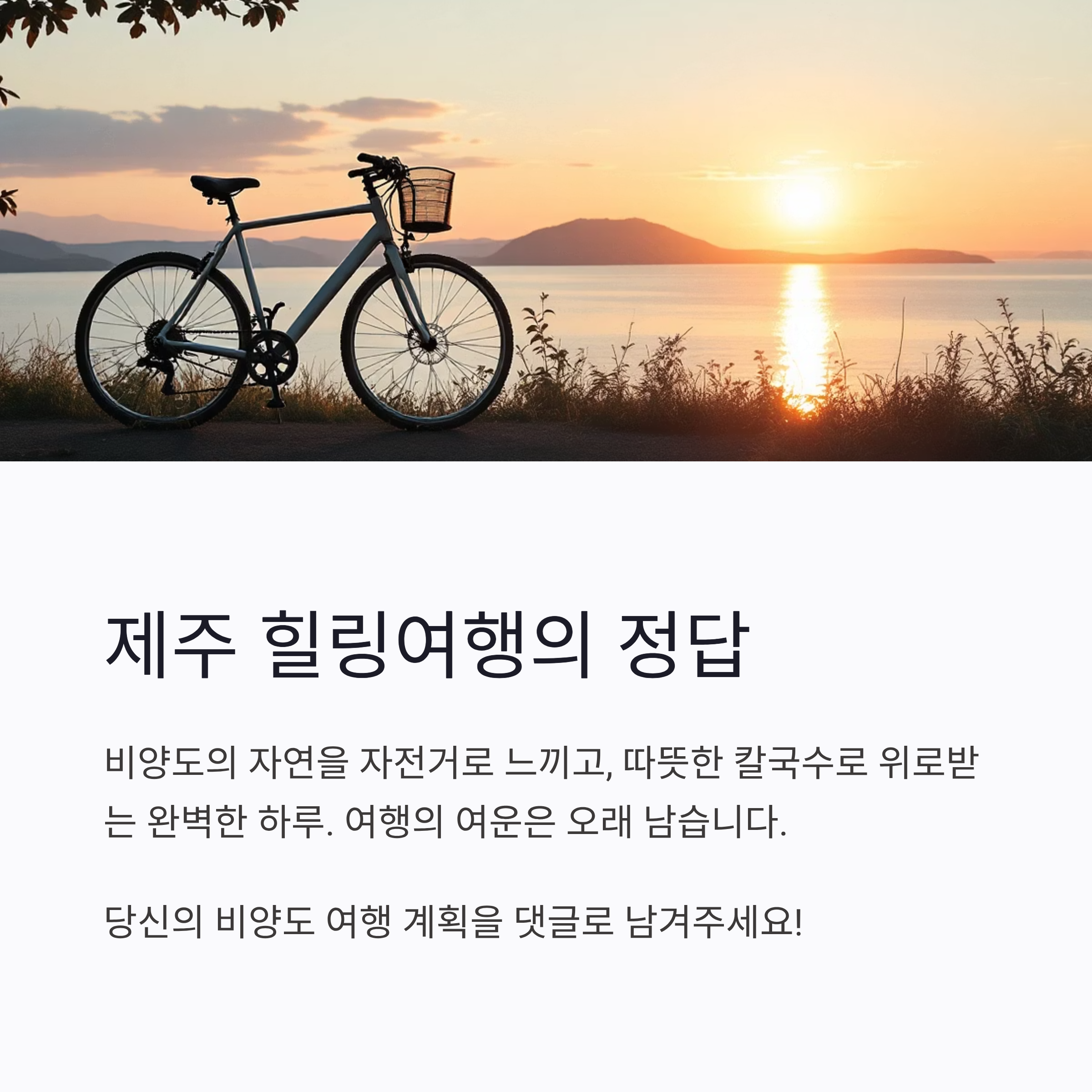 이 여행 조합은 단순히 풍경을 보는 것이 아닌 ‘체험’과 ‘회복’을 동시에 선사합니다.비양도 자전거 투어 + 칼국수 맛집 코스는 하루면 충분하지만,