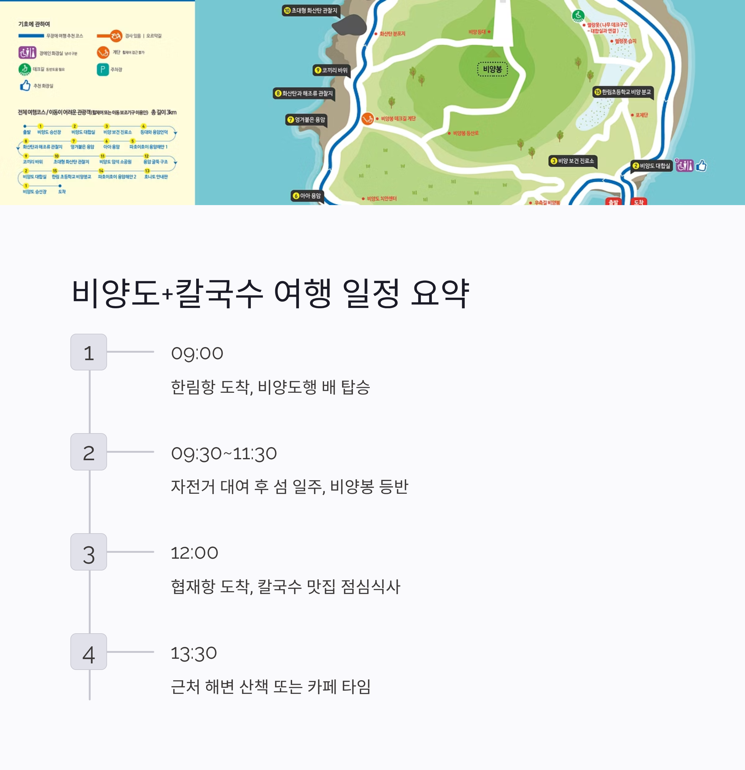 09:00 한림항 도착, 비양도행 배 탑승 09:20 비양도 도착, 자전거 대여 후 투어 시작 09:30~11:30 자전거 코스 일주, 비양봉 등반 및 포토타임 11:30 자전거 반납 후 비양도 선착장 이동 12:00 협재항 도착, 한림지역 칼국수 맛집 이동 및 점심식사 13:30 근처 해변 산책 또는 카페 타임