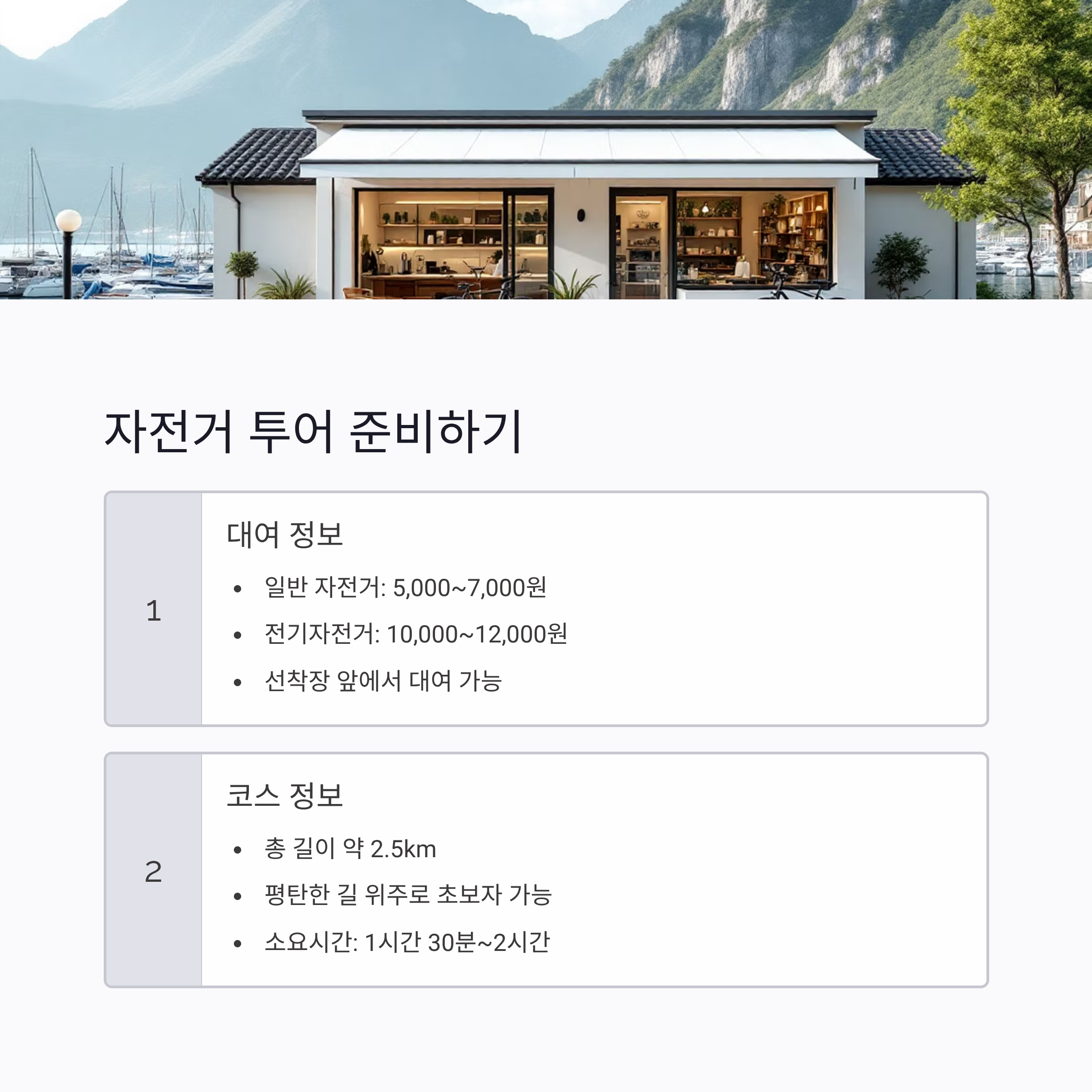 자전거는 선착장 앞에서 바로 대여할 수 있으며, 일반 자전거와 전기자전거가 모두 준비되어 있습니다.