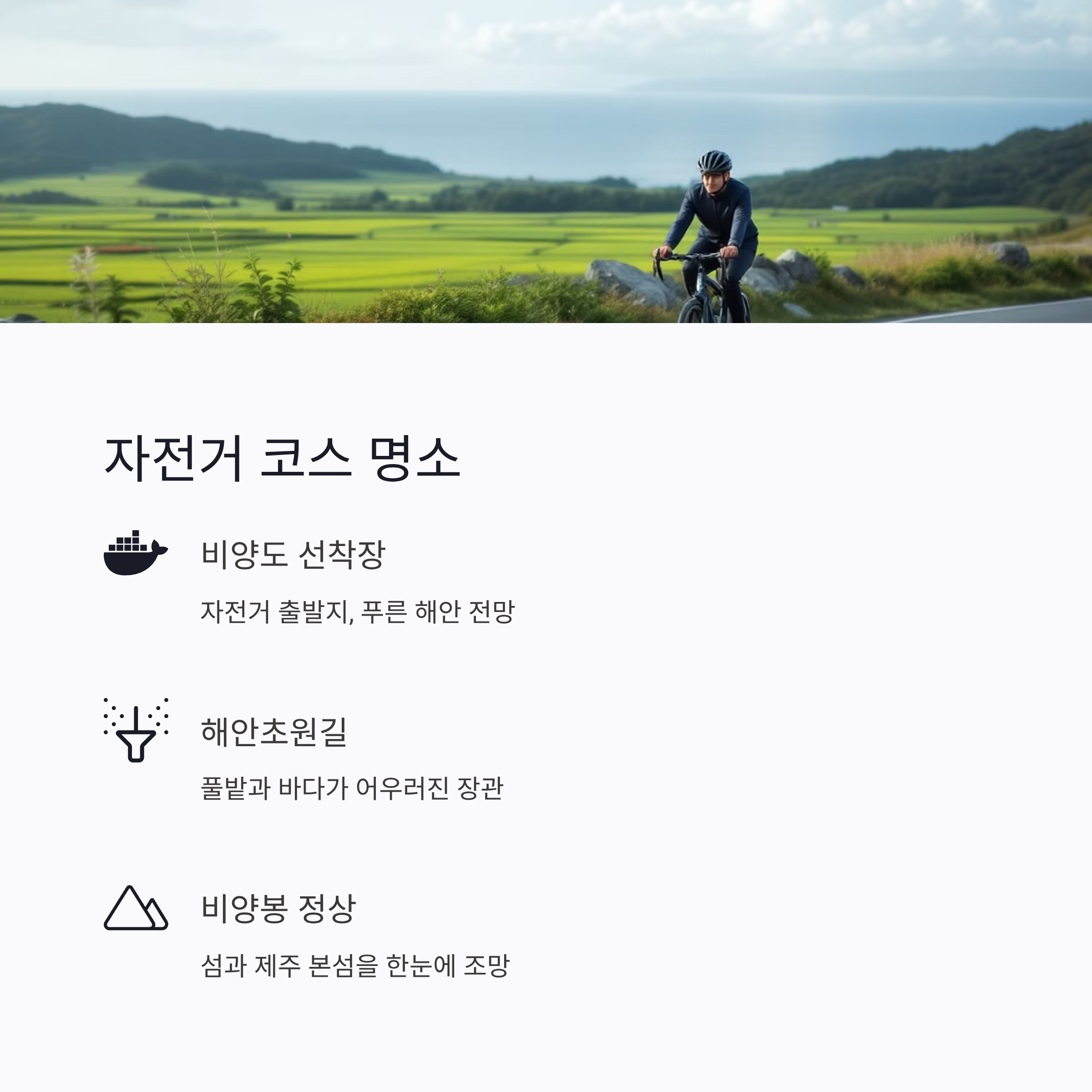 비양도 선착장 자전거 출발지. 배에서 내리자마자 펼쳐지는 푸른 해안 해안초원길 자전거길과 나란히 펼쳐진 풀밭과 바다가 장관 비양봉 정상 섬과 제주 본섬을 한눈에 조망할 수 있는 오름 전망대 방파제 포토존 파도와 하늘, 자전거가 어우러지는 인기 사진 스팟 자전거를 타고 천천히 섬을 돌다보면, 멀리 한라산이 보이고