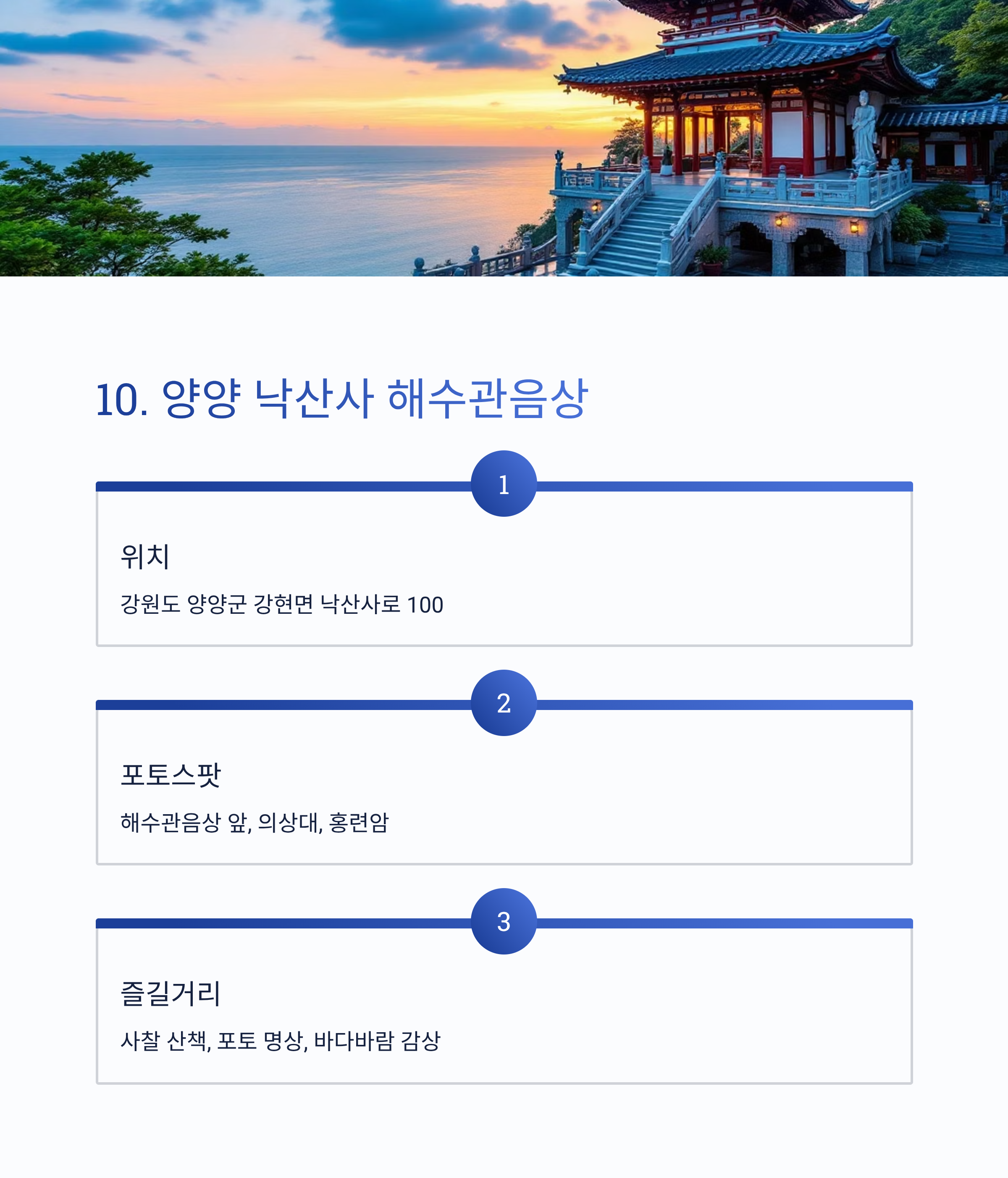 8월 말 노을이 지는 시간대에 방문하면 감동적인 뷰를 감상할 수 있어요.주요 포토스팟: 해수관음상 앞, 의상대, 홍련암