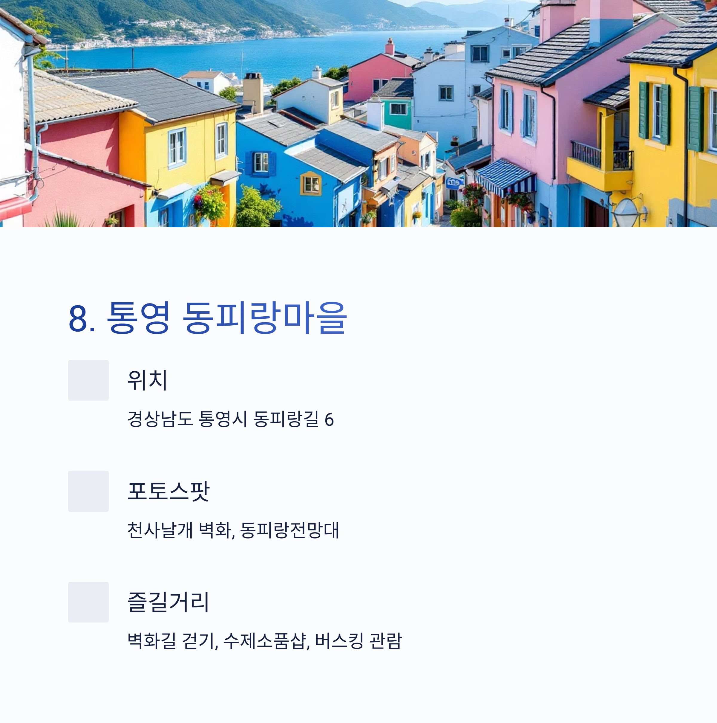 근처 통영항, 중앙시장도 함께 들러보면 알찬 하루 일정이 완성됩니다.주요 포토스팟: 천사날개 벽화, 동피랑전망대