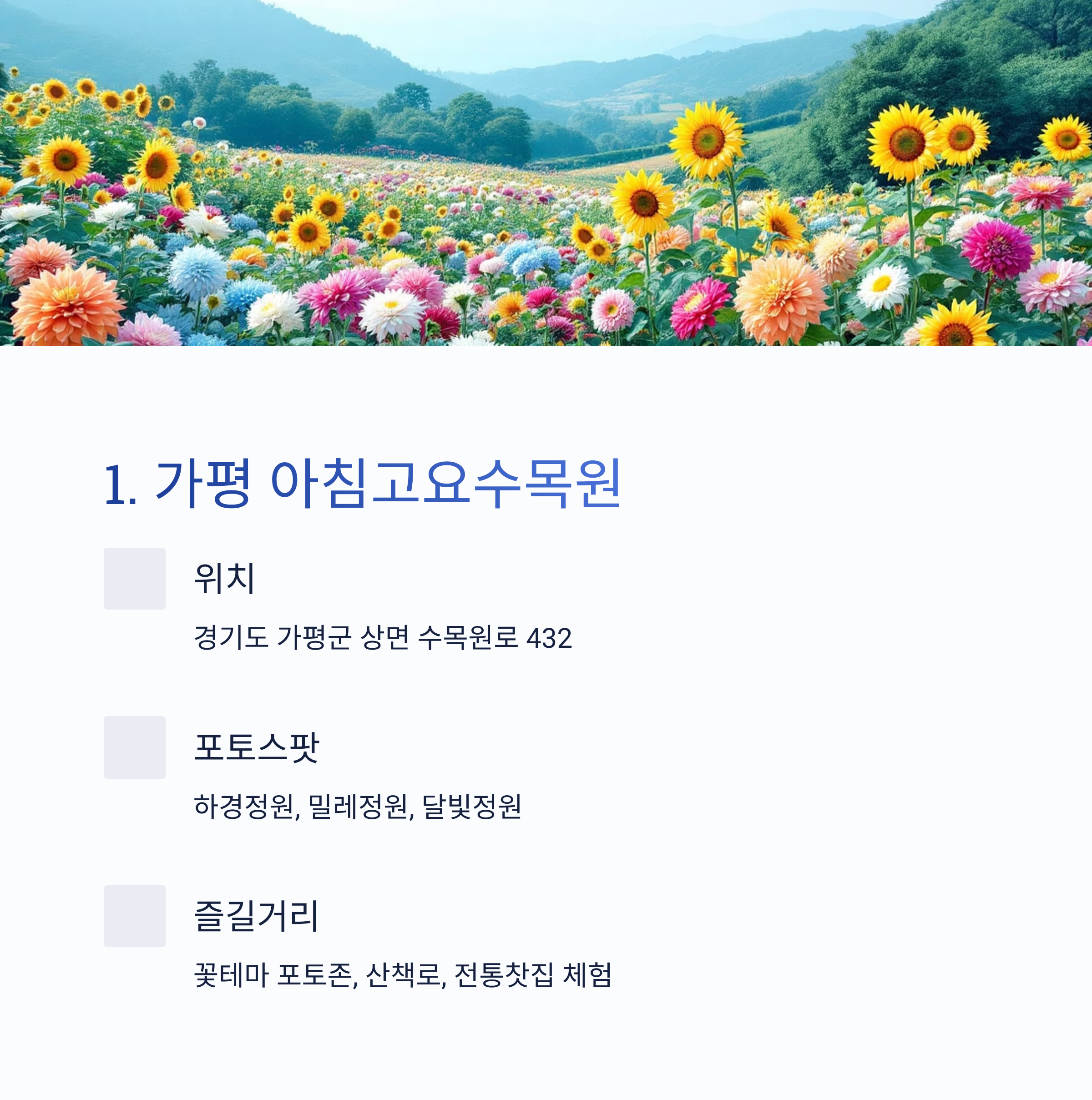 8월 말에는 백일홍, 해바라기, 다알리아가 만개하며 인생샷 명소로 떠오릅니다.