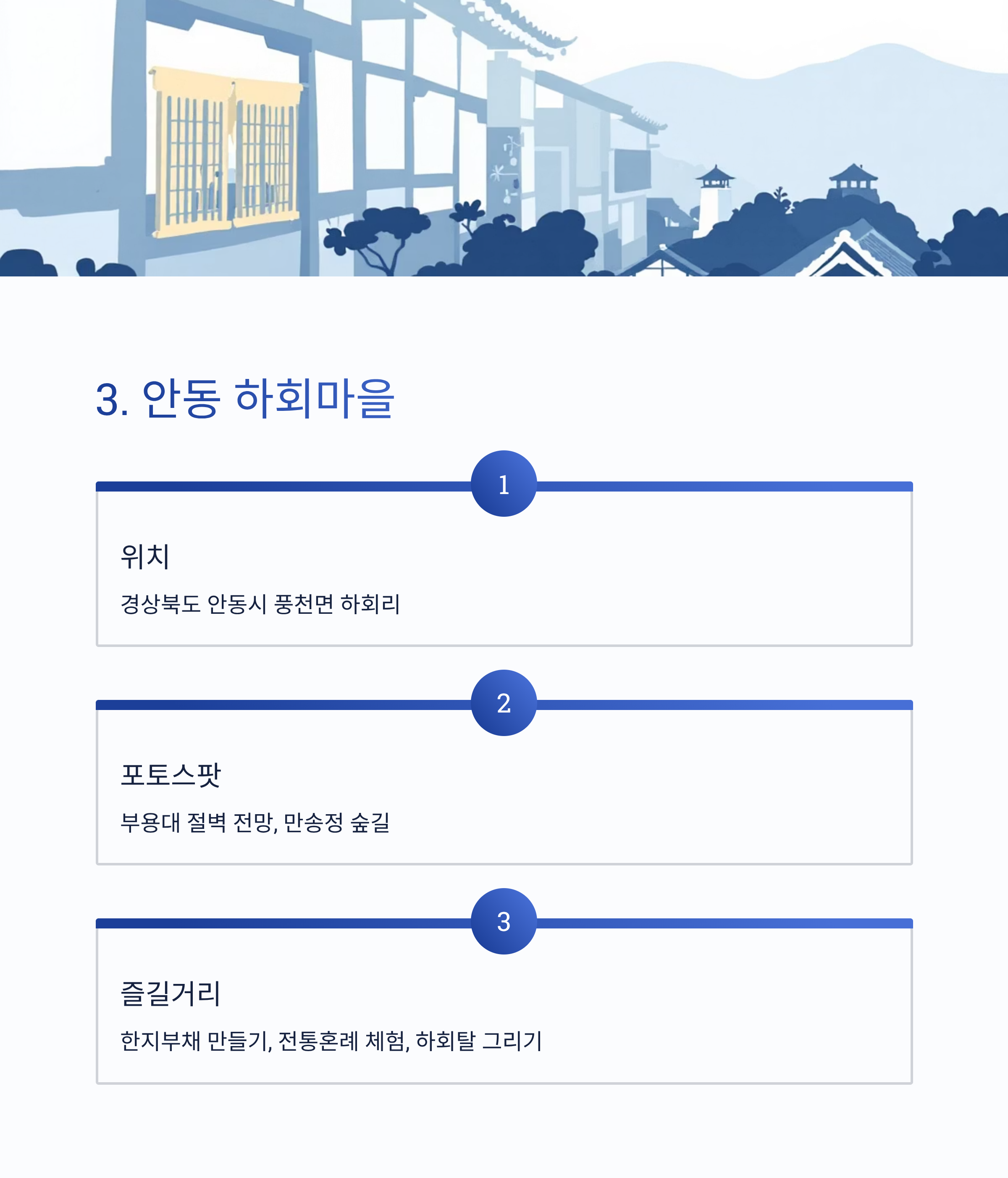 전통체험과 마을 걷기, 고택 숙박 등 고즈넉한 분위기를 느낄 수 있어요.주요 포토스팟: 부용대 절벽 전망, 만송정 숲길