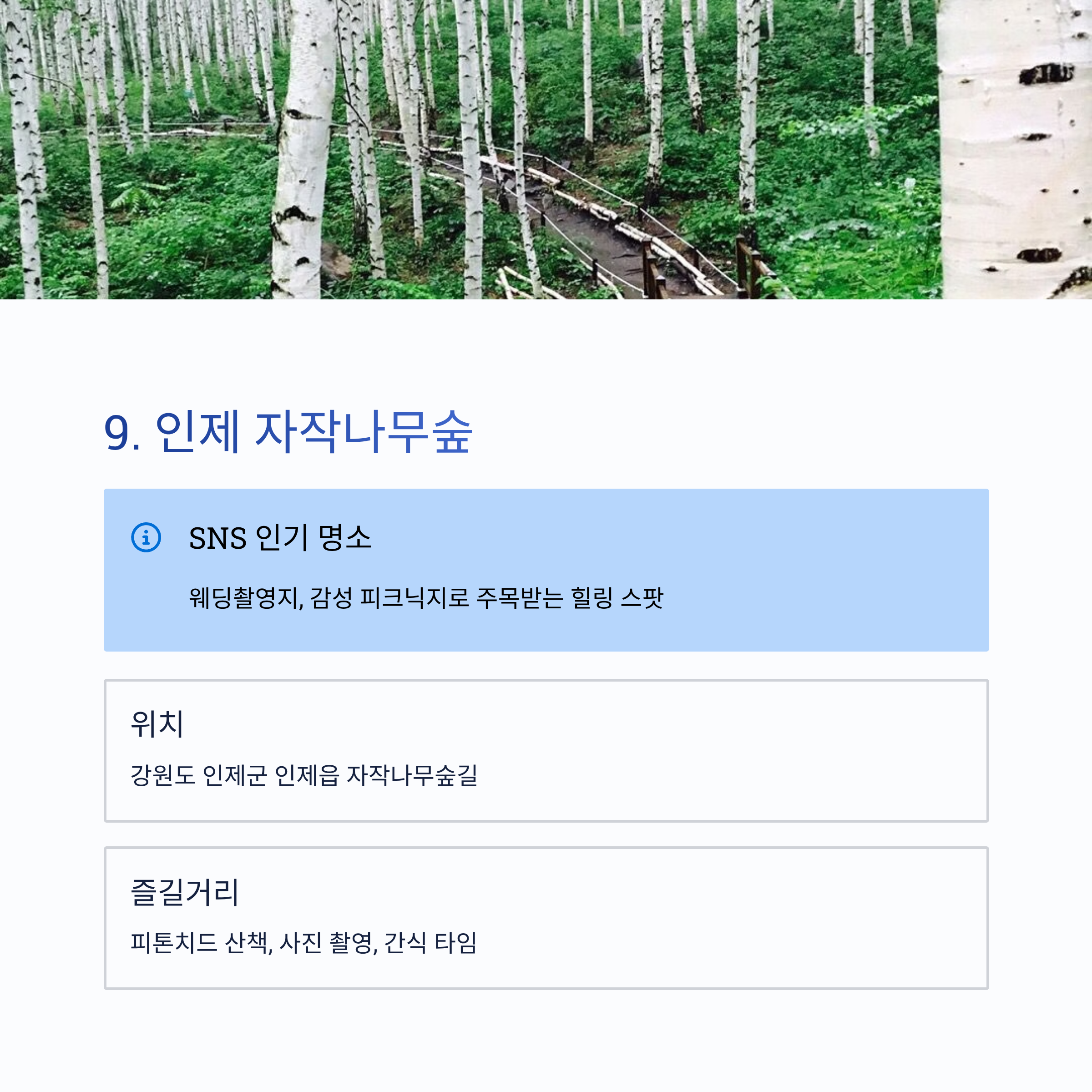 SNS에서는 웨딩촬영지, 감성 피크닉지로도 주목받고 있습니다.주요 포토스팟: 숲속 벤치, 자작나무 쉼터