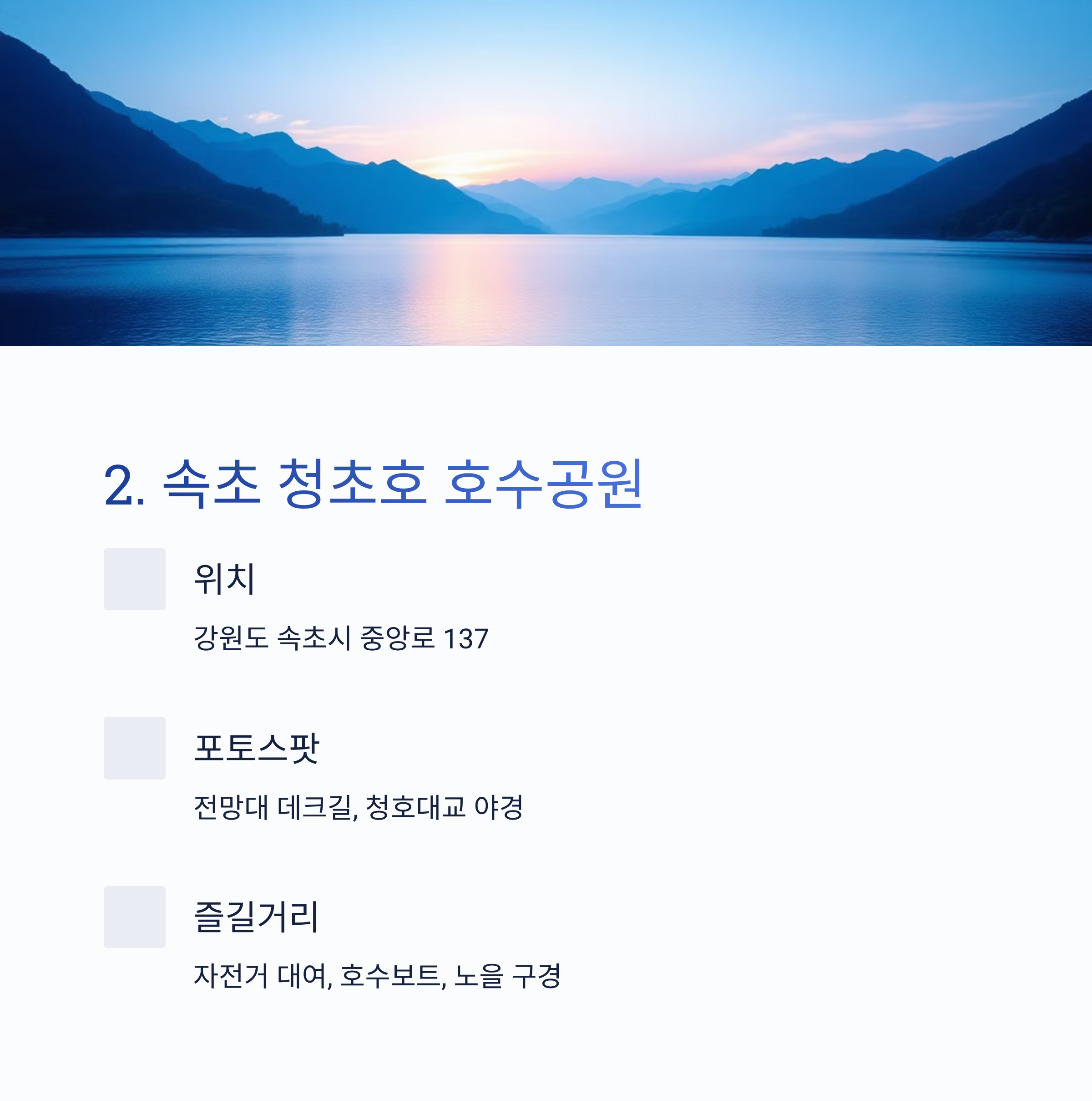 주변에 속초 관광수산시장과 속초해수욕장도 인접해 당일치기 코스로도 좋아요.주요 포토스팟: 전망대 데크길, 청호대교 야경