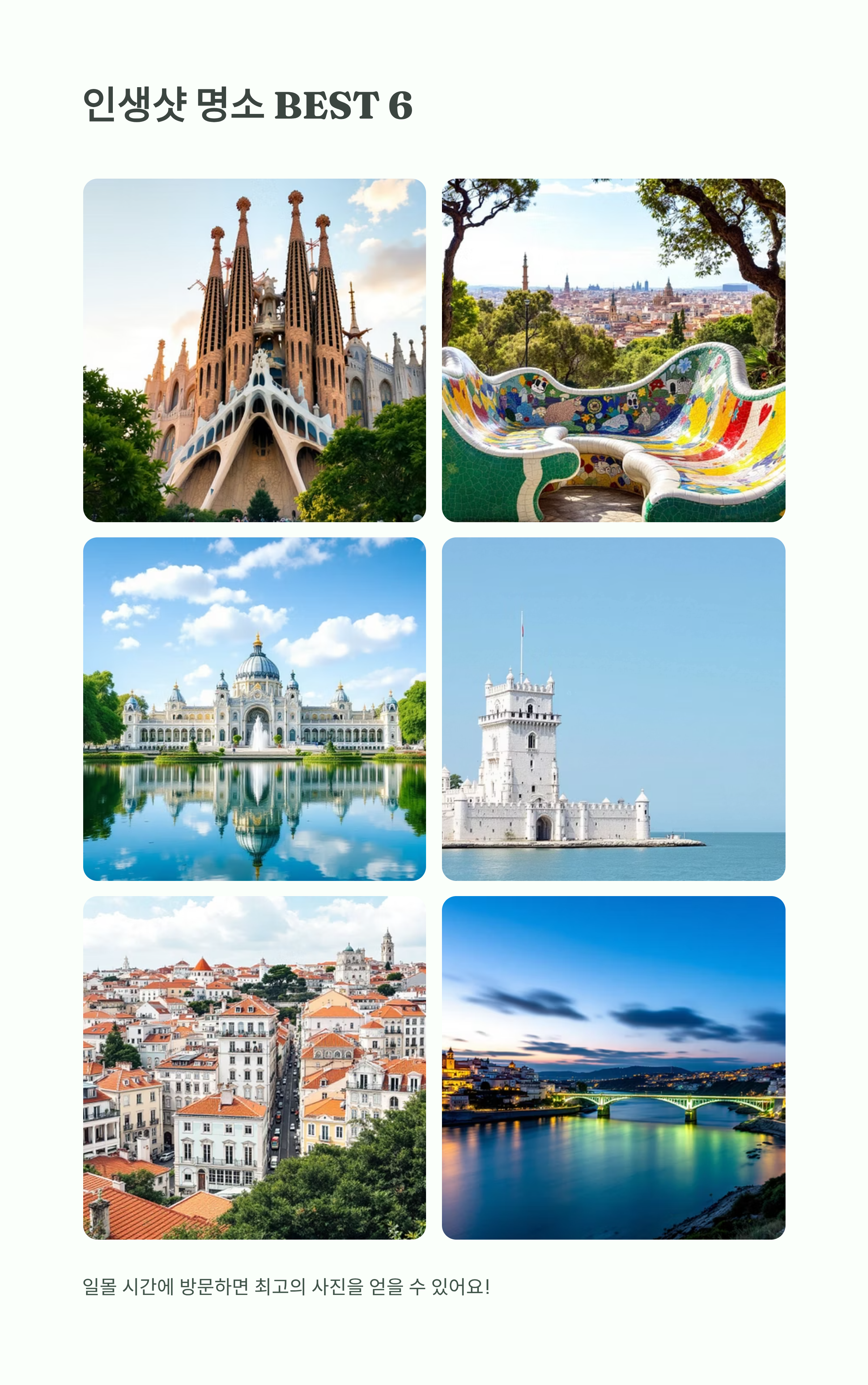 사그라다 파밀리아 바르셀로나 해질녘 조명 반사 장면이 환상적 구엘공원 모자이크 벤치 바르셀로나 인스타 인증샷 1위 배경 레티로 공원 유리궁전 마드리드 반사되는 햇빛과 호수 풍경 인기 벨렘탑 전경 리스본 하늘과 바다 경계가 아름다운 포인트 알파마 언덕 전망대 리스본 트램과 주황 지붕 도시가 한눈에 도우루강 야경 포르투 조명 켜진 다리와 리베이라 배경이 베스트샷