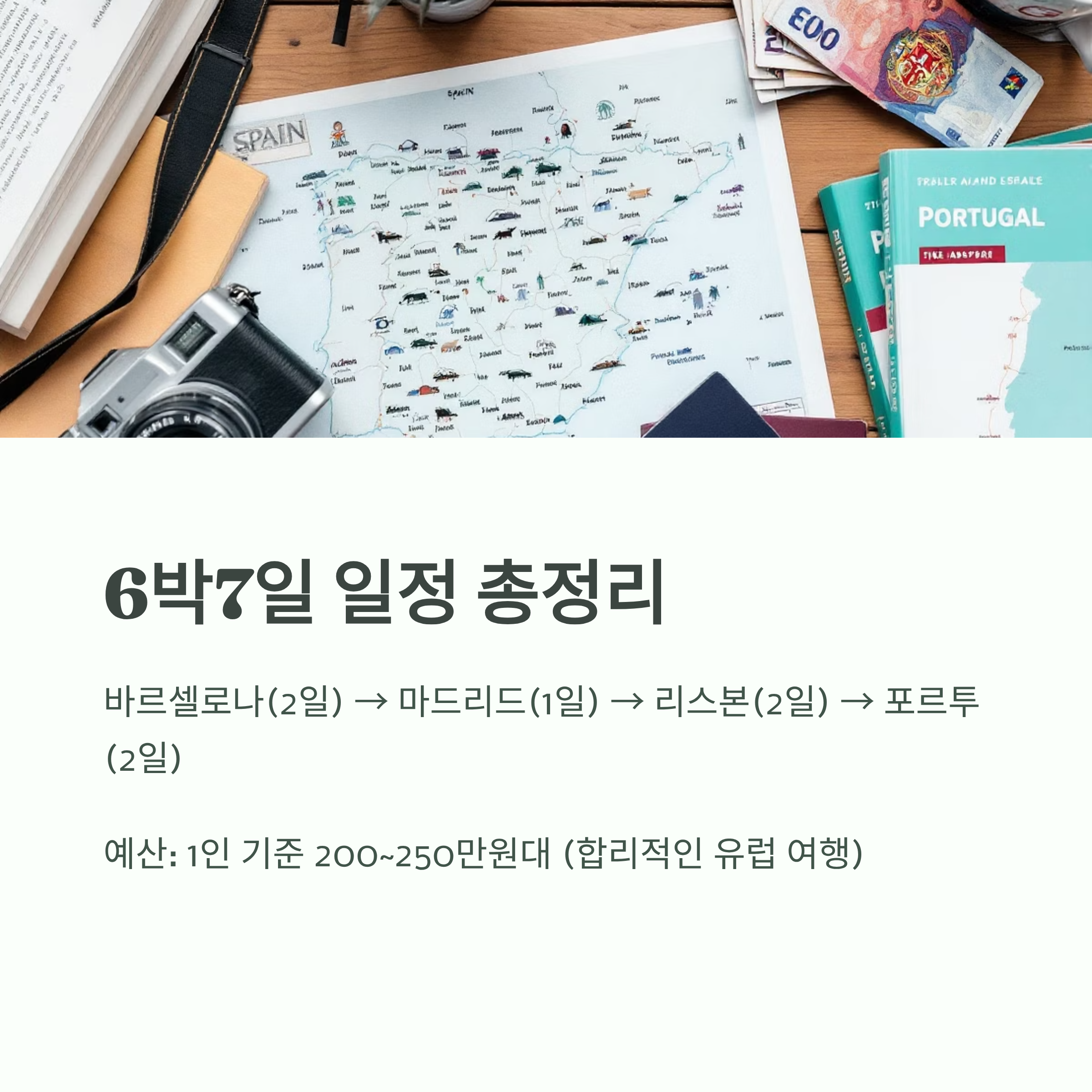 1일차 바르셀로나 도착 후 사그라다 파밀리아, 구엘공원 바르셀로나 2일차 바르셀로나 바르셀로네타 해변, 람블라스 거리 바르셀로나 3일차 마드리드 프라도 미술관, 레티로 공원 마드리드 4일차 리스본 트램28, 벨렘탑, 파두 감상 리스본 5일차 리스본 LX 팩토리, 골목 산책 리스본 6일차 포르투 도우루강 투어, 렐루서점 포르투 7일차 포르투 쇼핑 후 공항 이동 포르투 고속열차(AVE/Alfa Pendular) 또는 저가항공(LCC)을 활용하면