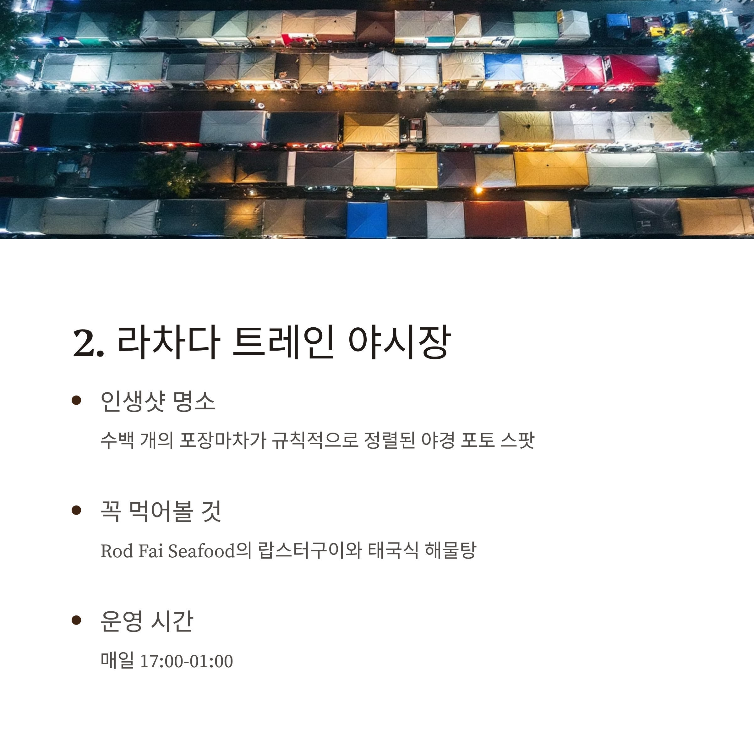 17:00~18:30 야시장 오픈시간 입장, 구경 시작 라차다 트레인 야시장 OR 짜뚜짝 그린 18:30~20:00 메인 푸드 시식, 해산물 or 태국요리 식사 체험 Rod Fai Seafood / Mae Ouan 20:00~21:00 포토존 촬영, 감성 사진 남기기 에스플러네이드 옥상 / 찬 로드 비행기 21:00~22:30 간식 쇼핑 or 라이브 공연 감상 아시아티크 / 짜뚜짝 그린 시장 22:30~24:00 루프탑 바 or 조용한 로컬시장 탐방 찬 로드 루프바 / 짜런삭 로컬시장