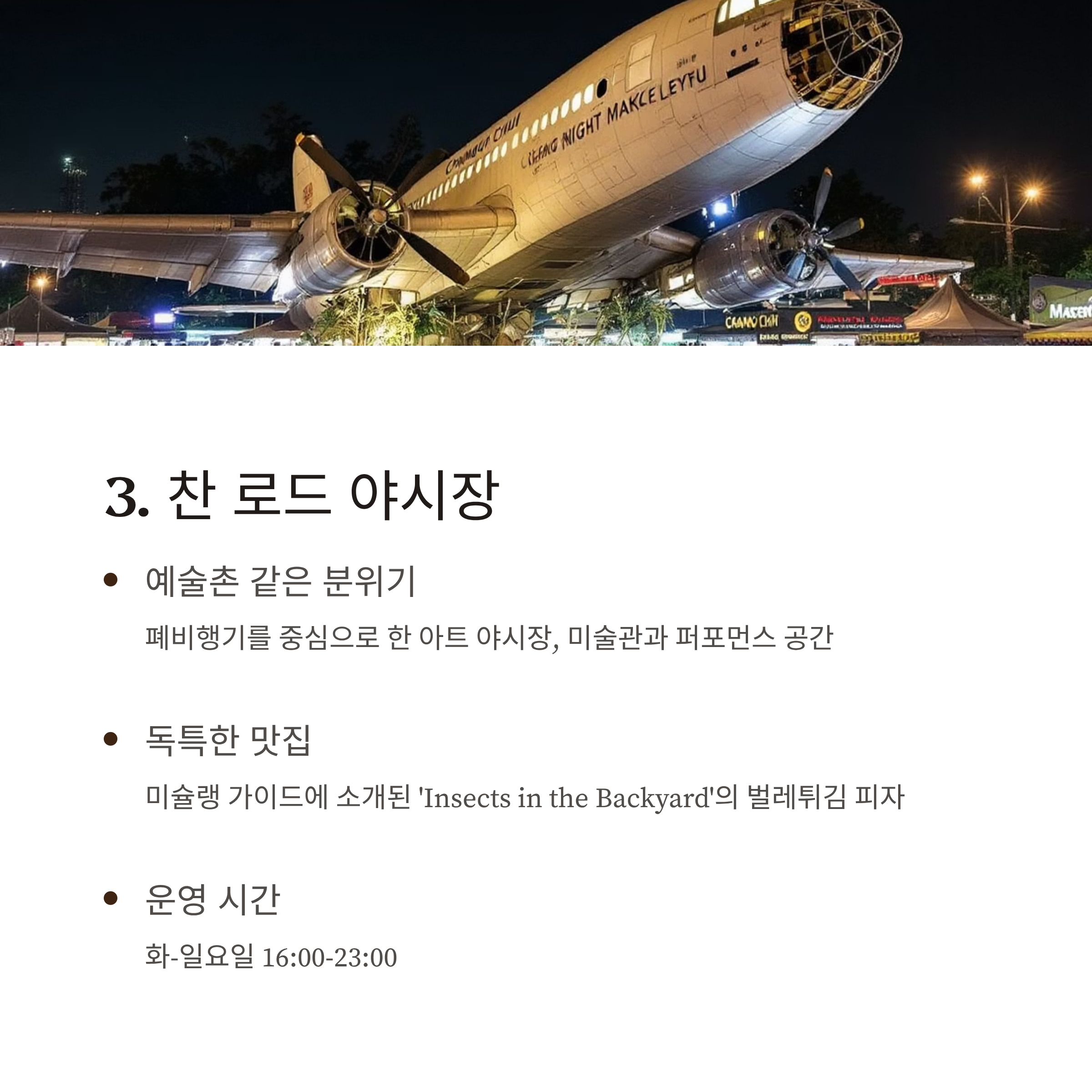 운영 시간: 화요일 - 일요일 16:00 - 23:00특징: 폐비행기를 중심으로 구성된 아트 야시장으로