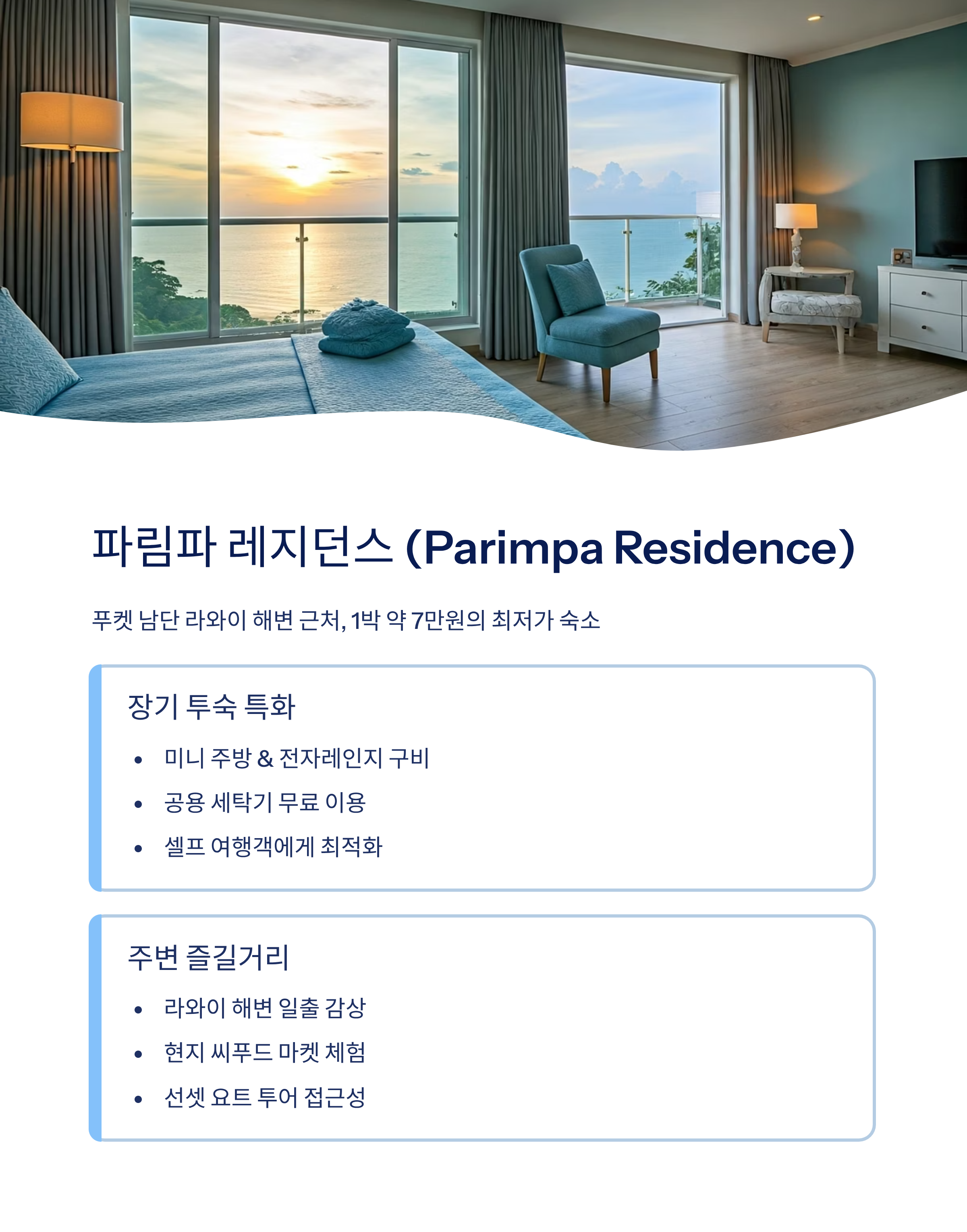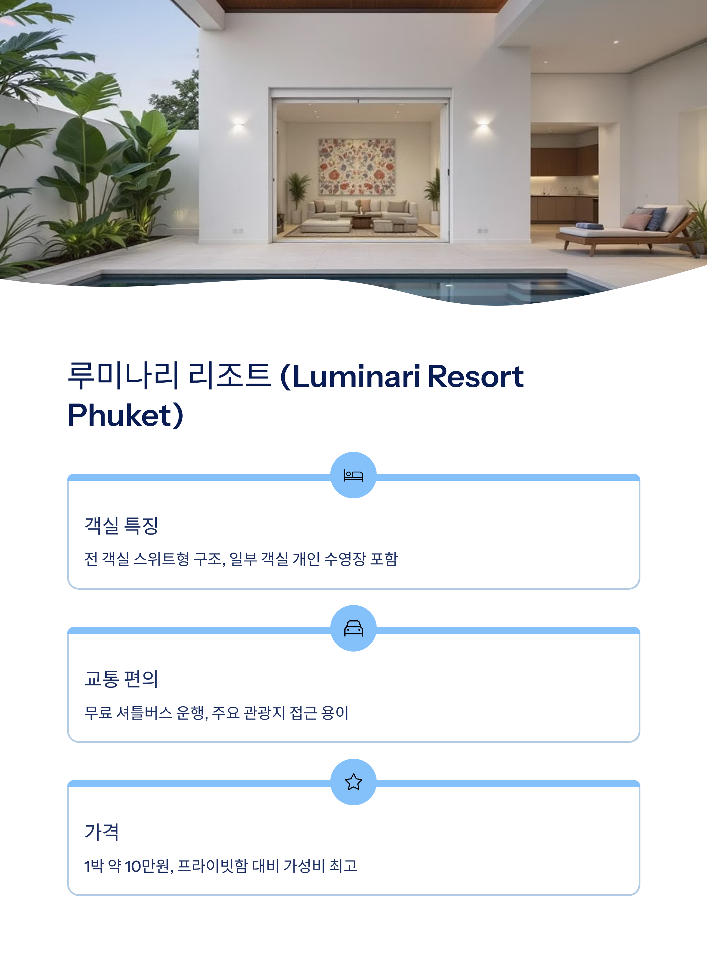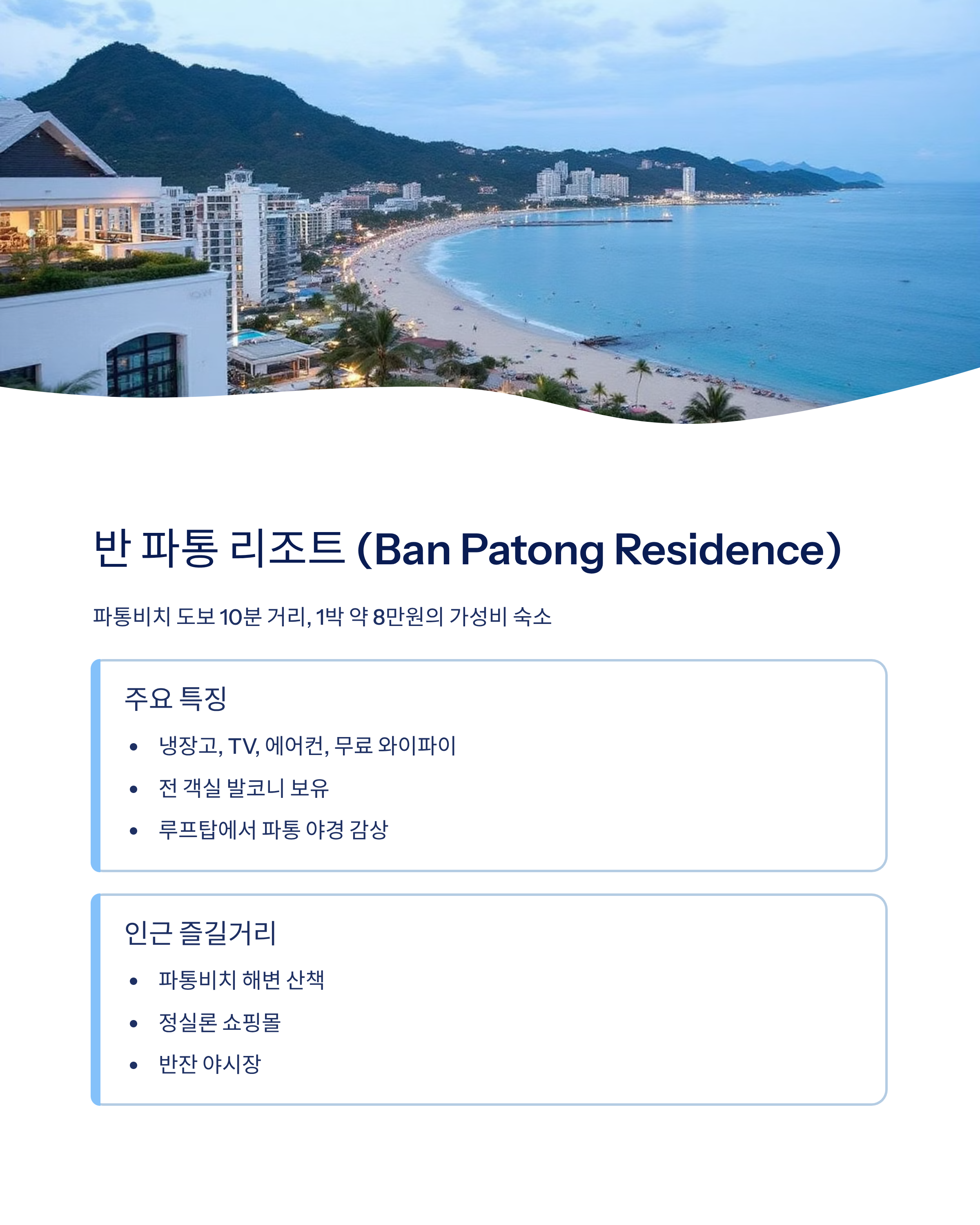 반 파통 리조트 파통 약 8만원 루프탑 전망 해변 도보 10분 더 브리즈 푸켓타운 약 9만원 로컬 체험 최적 타운 중심 카말라 트로피칼 카말라 약 10만원 자연 속 힐링 조용한 지역 루미나리 리조트 카투 약 10만원 신축, 프라이빗 셔틀버스 운영 파림파 라와이 약 7만원 장기 여행 최적 해변 인근 디 룸 리조트 찰롱 약 9만원 친환경 인테리어 명소와 근접