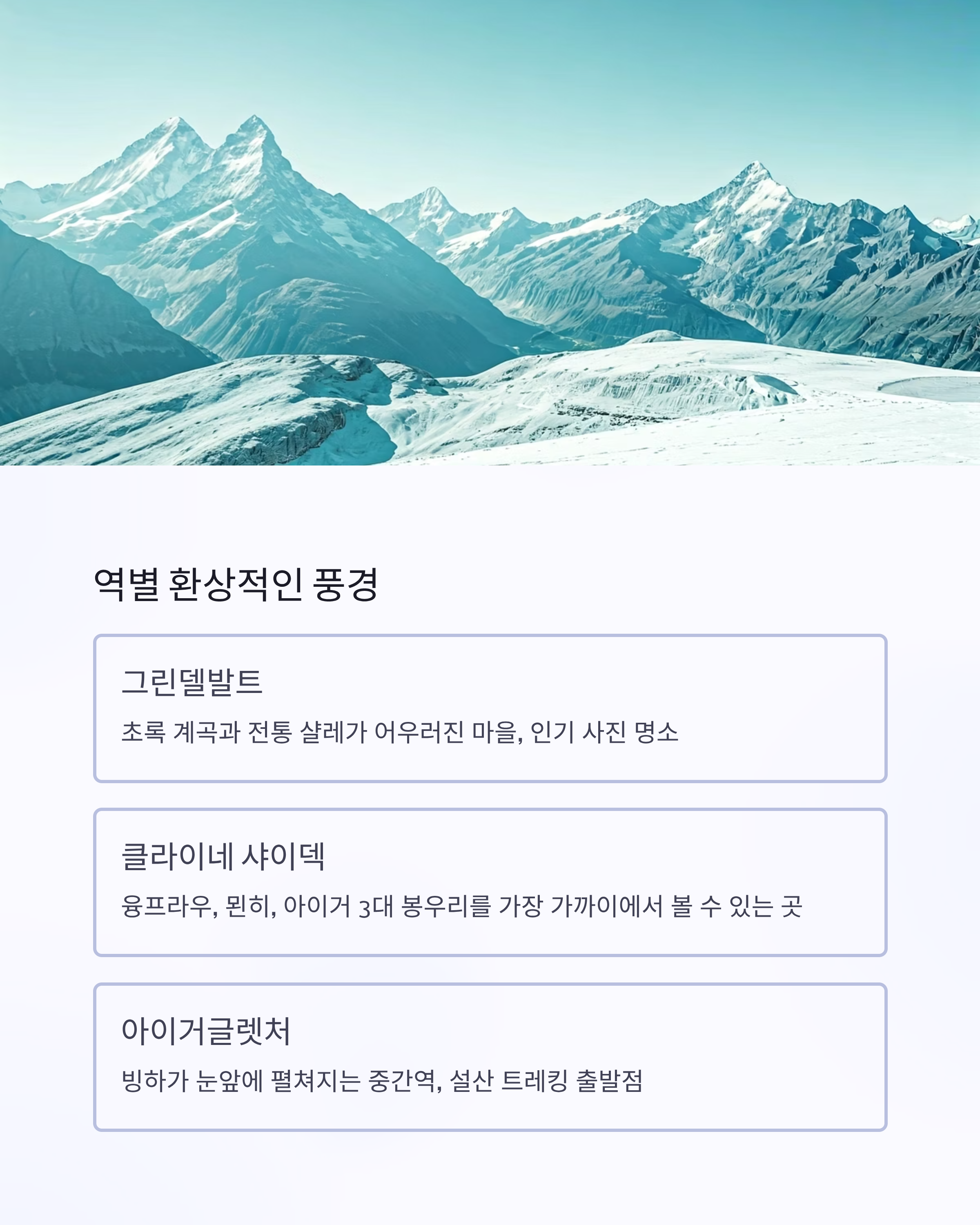융프라우 열차는 지나는 역마다 전혀 다른 풍경을 보여줍니다.