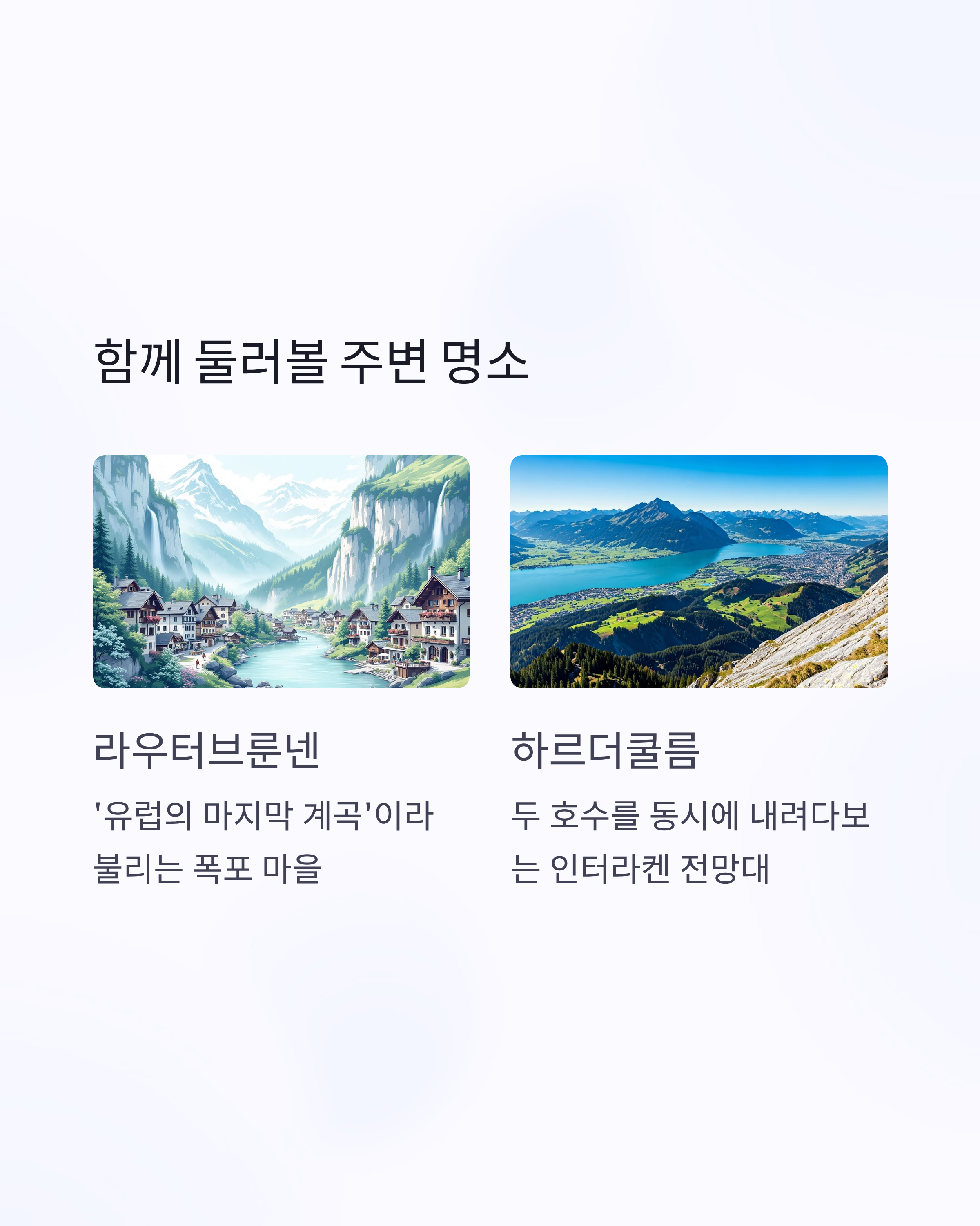 인터라켄에서 케이블카로 10분 거리. 툰 호수와 브리엔츠 호수를 동시에 내려다볼 수 있는 포토스팟
