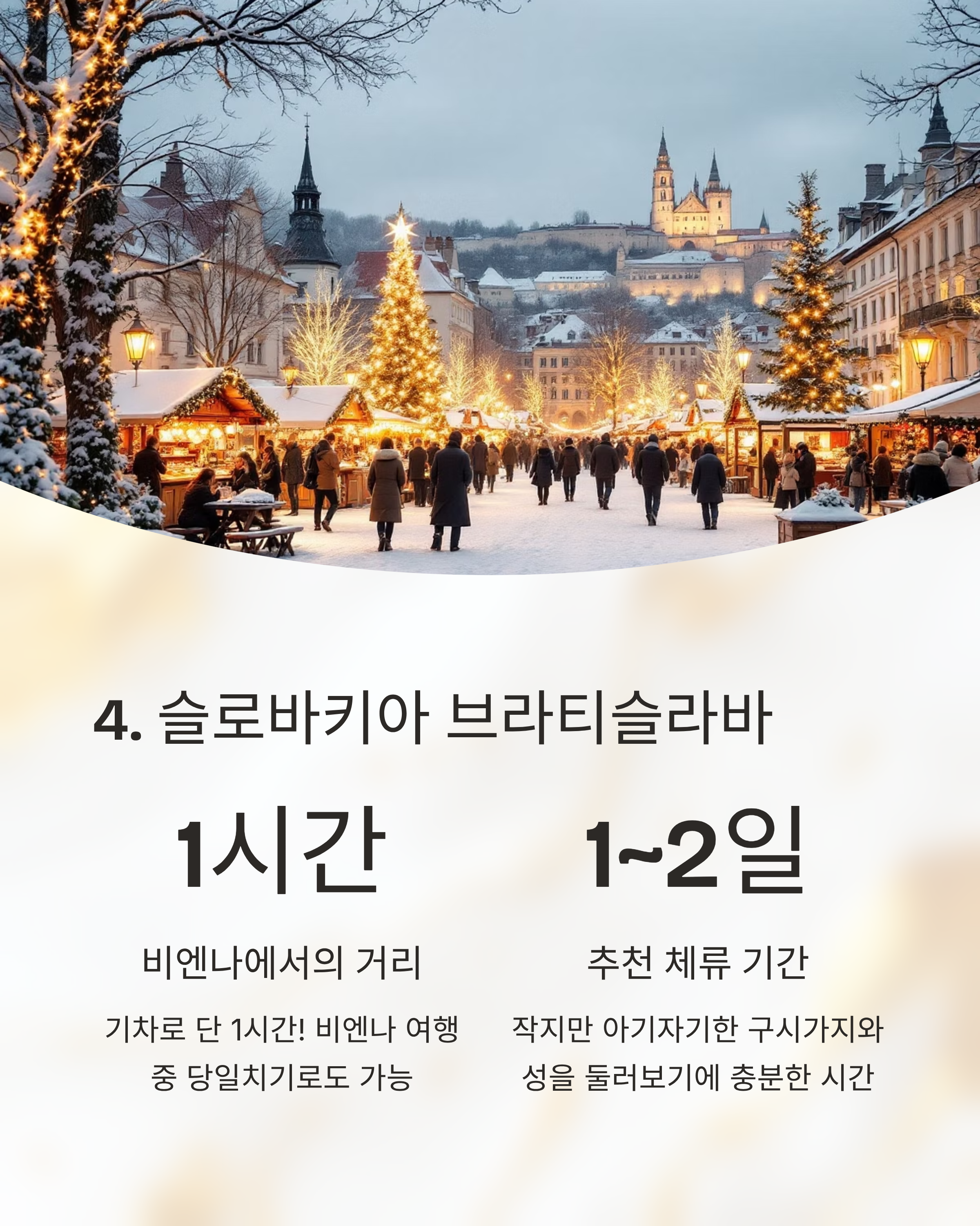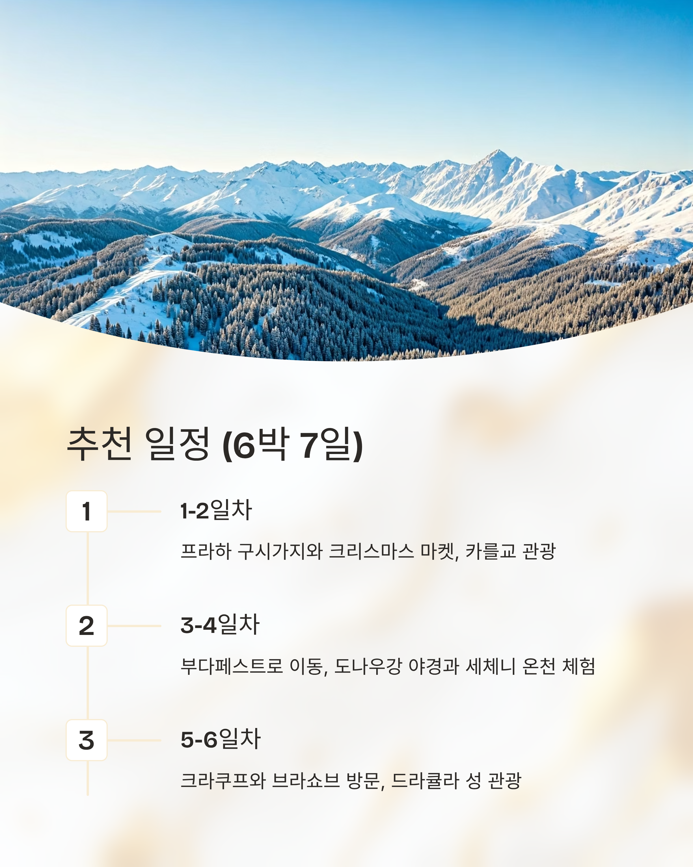 프라하 로맨틱 감성, 역사적 건축 구시가 크리스마스 마켓 3~4일 부다페스트 온천+야경, 왕궁 보로슈마르티 광장 3일 크라쿠프 고요한 분위기, 저렴한 물가 중앙시장 마켓 2~3일 브라티슬라바 소도시 감성, 비엔나 접근 메인광장 마켓 1~2일 브라쇼브 전설+눈풍경, 자연 중앙광장 트리 2일