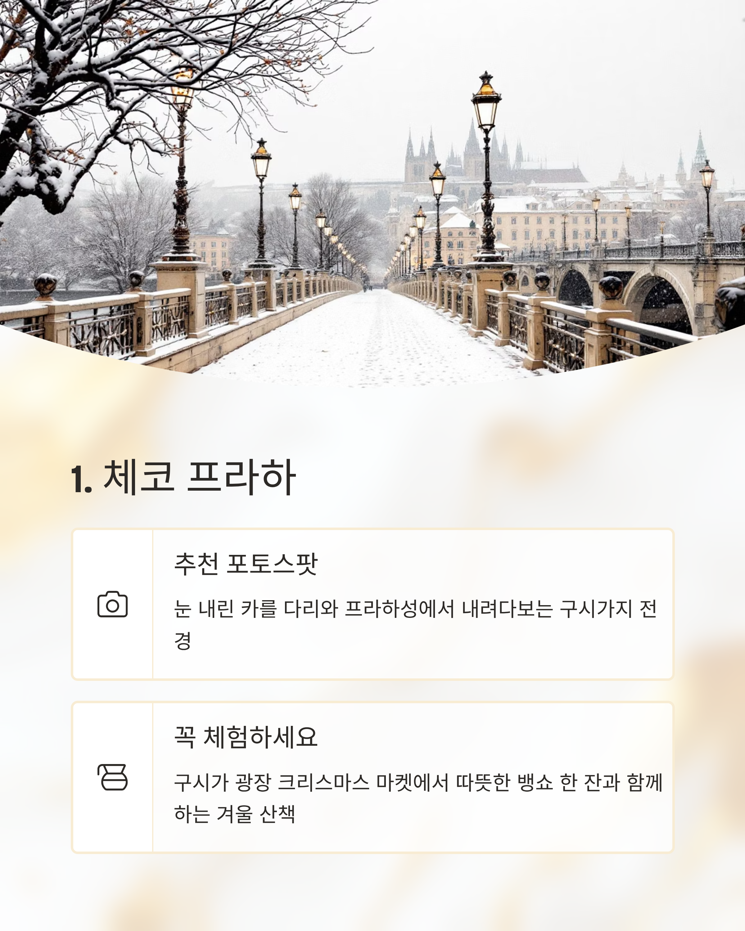 “크리스마스 시즌에 프라하는 그야말로 동화책을 걷는 느낌이었어요. 따뜻한 뱅쇼 한 잔에 눈 오는 거리 풍경은 아직도 잊히지 않아요.”