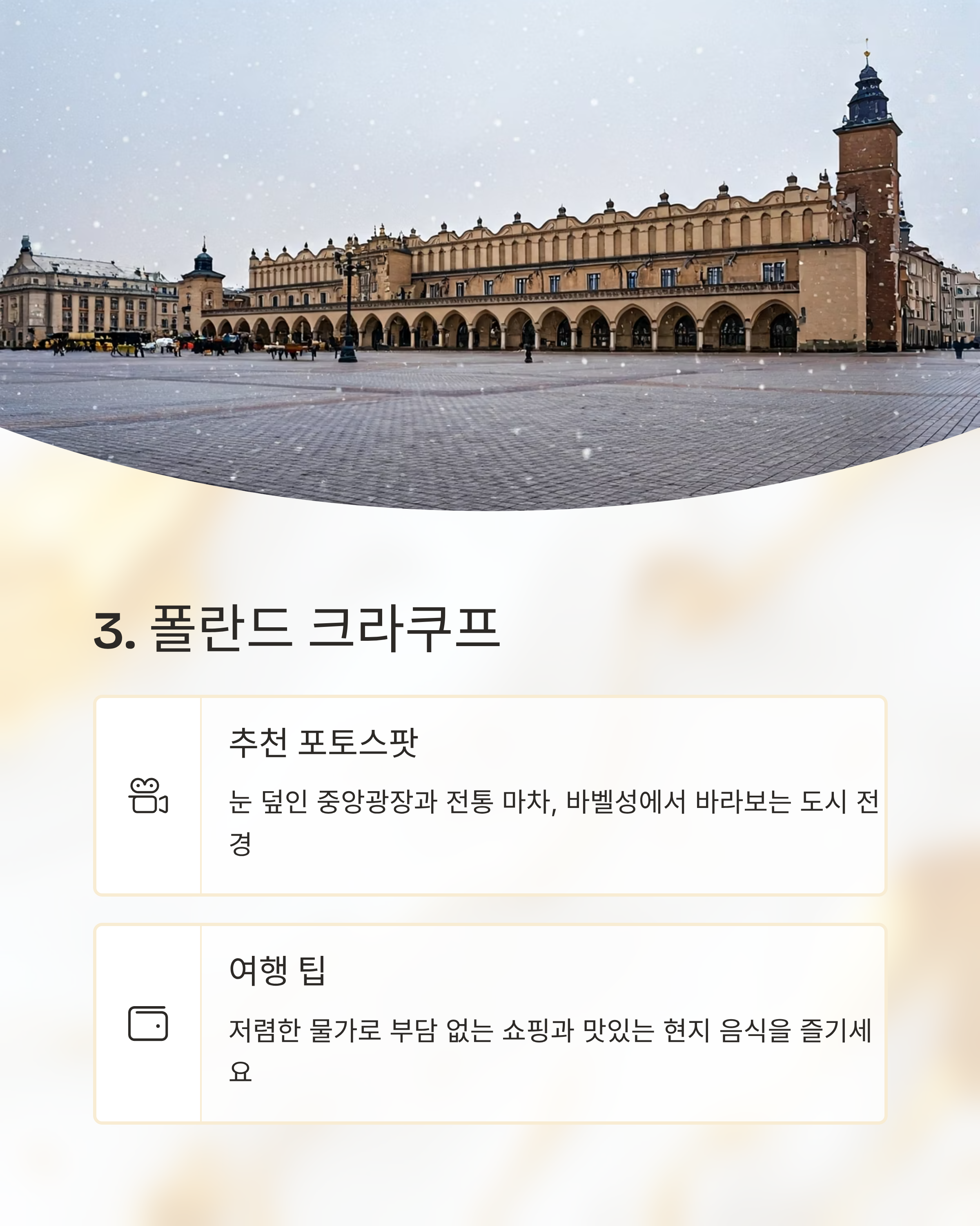 12월, 크리스마스 시즌의 동유럽은 동화 속 한 장면 같은 겨울 풍경과 아기자기한 마켓, 그리고 유럽 특유의 고풍스러운 건축이 어우러져 전 세계 여행자들을 사로잡습니다. 특히 눈 내리는 도시에서 크리스마스를 보내는 건 평생 기억에 남을 특별한 경험이죠. 이번 글에서는 최신 여행 트렌드와 SNS 인기 게시물을 기반으로 ‘12월에 가장 아름다운 눈 내리는 동유럽 도시 TOP5’를 선정해 소개드립니다. 각 도시의 추천 장소, 특징, 포토스팟, 체험 후기까지 모두 담았습니다.