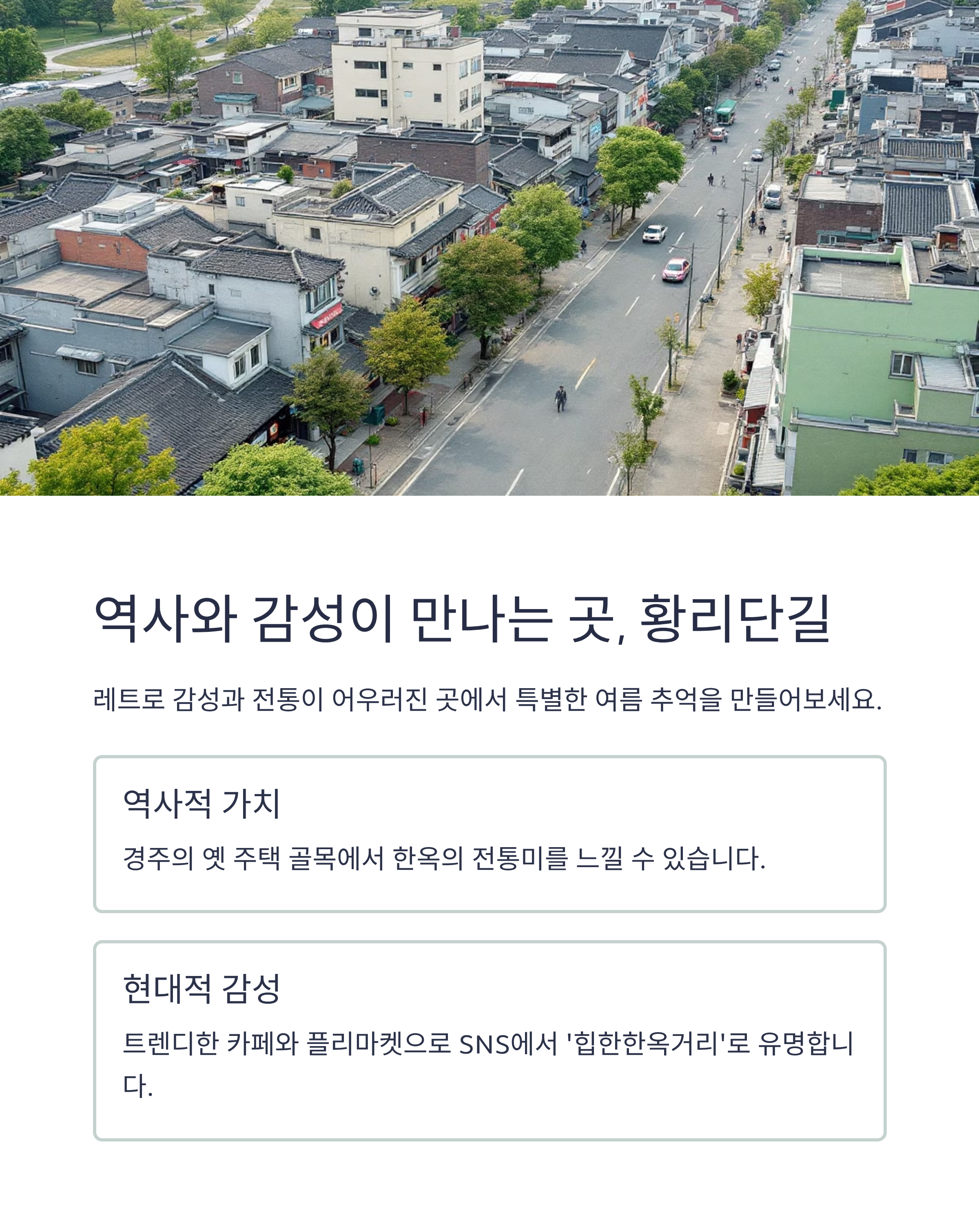경주는 역사의 도시인 동시에 감성을 자극하는 여행지로도 유명합니다. 그중에서도 황리단길은 레트로 감성, 전통과 현대가 어우러진 분위기, 그리고 다양한 맛집과 포토존으로 뜨거운 여름에도 여전히 사람들로 북적이는 인기 명소입니다. 본문에서는 2025년 여름 기준 최신 자료를 바탕으로 황리단길의 매력을 낱낱이 소개하고, 추천 스팟의 주소, 특징, 즐길거리, 사진 명소까지 상세히 알려드립니다. 더불어 여행 일정을 계획하시는 분들을 위해 비교표 형식의 일정 요약도 준비했습니다.
