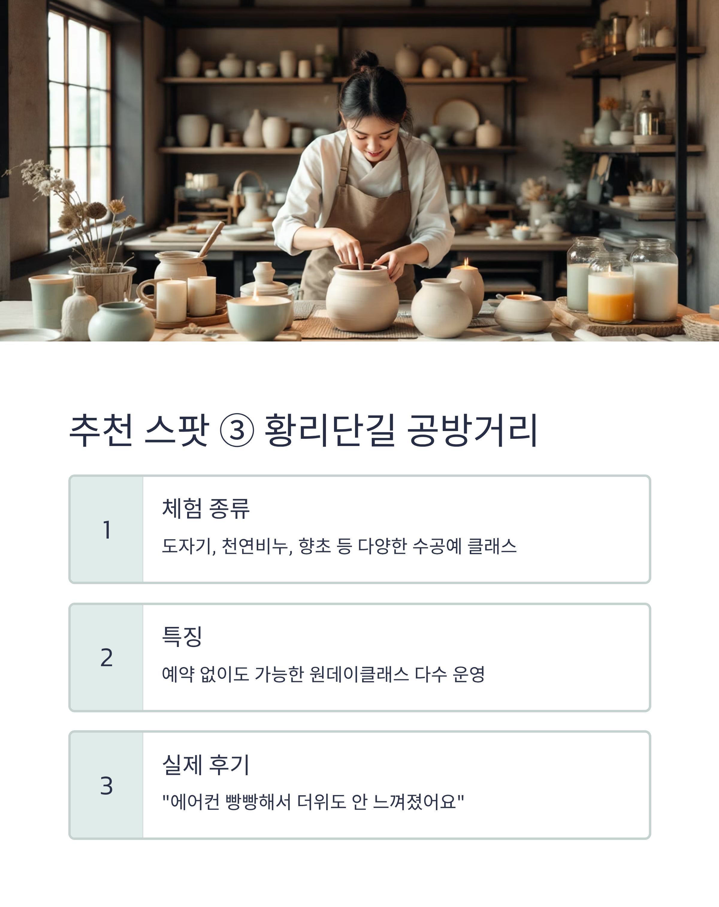특징: 도자기, 천연비누, 향초 등 수공예 클래스 다양