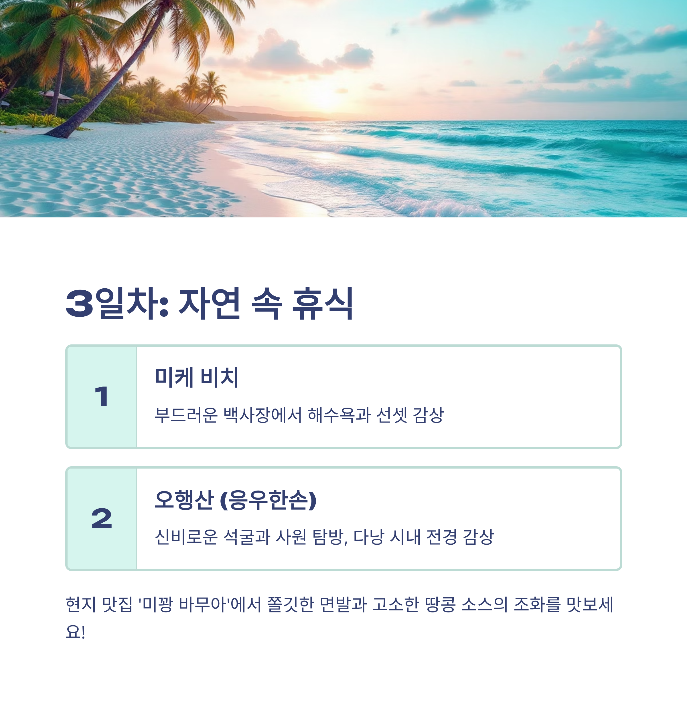 셋째 날: 미케비치와 오행산, 자연 속 휴식