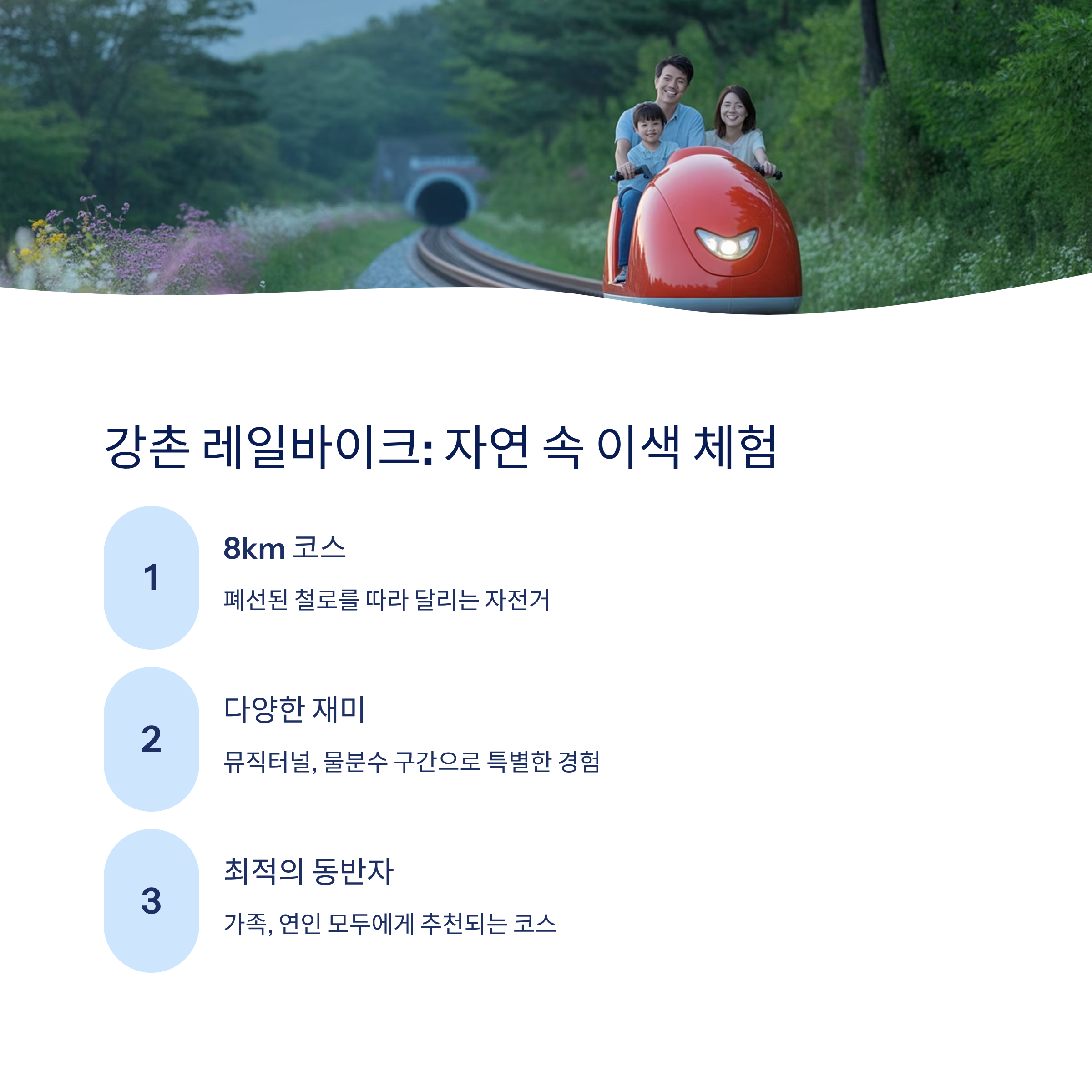 폐선된 철로를 따라 자전거를 타고 자연을 즐길 수 있는 체험형 콘텐츠입니다. 총
