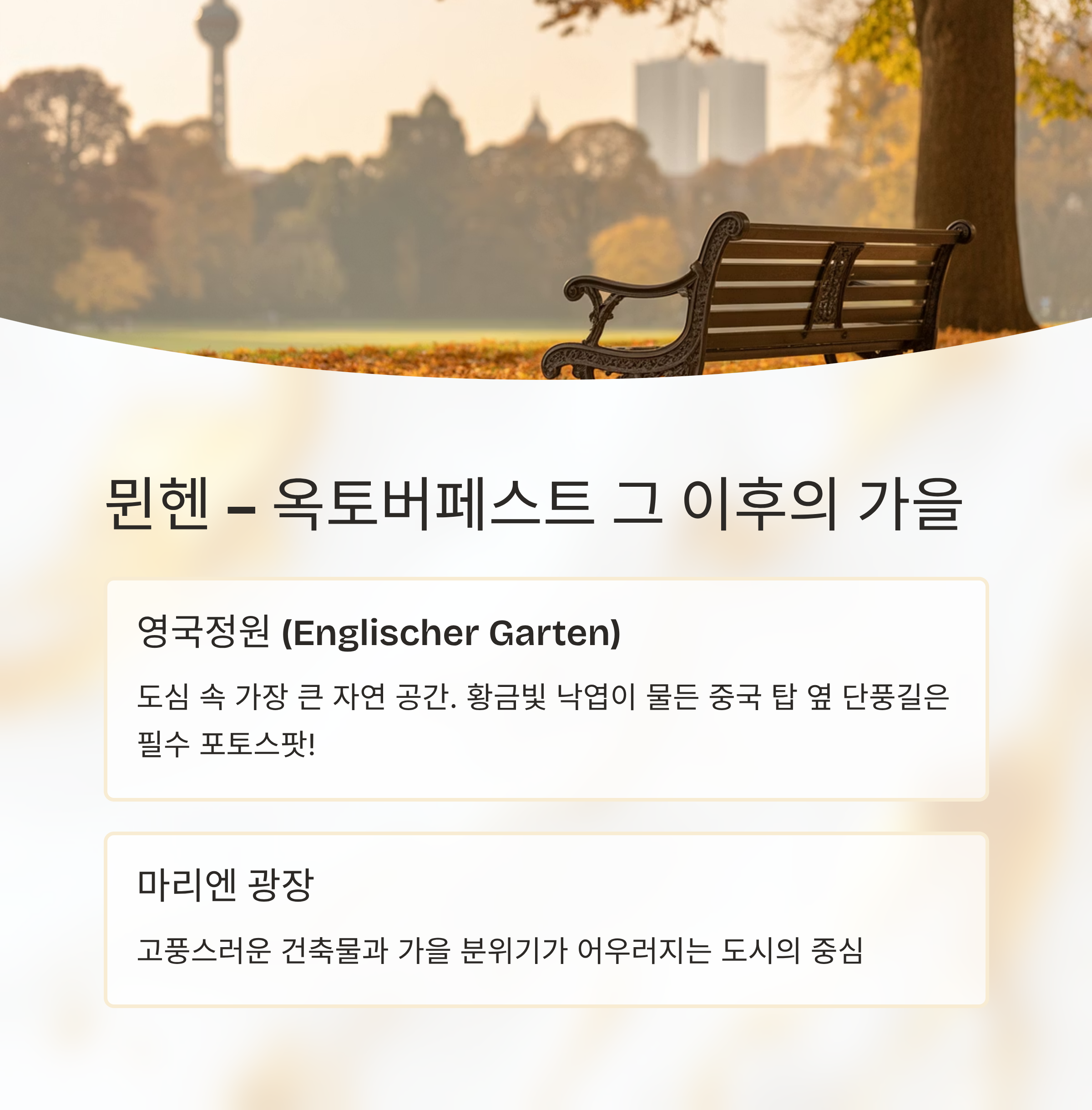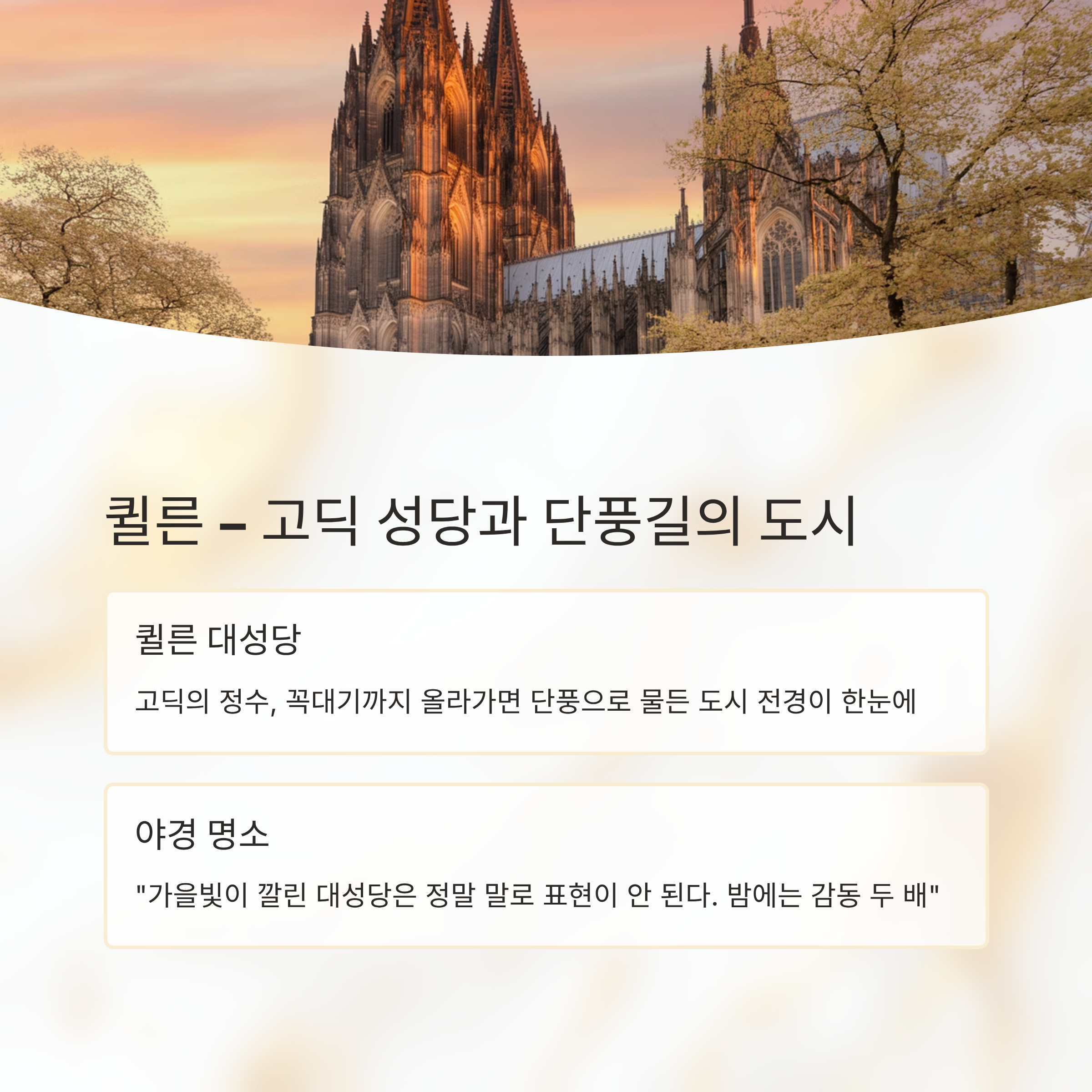 도시 분위기 전통+현대 공존, 가을 낙엽 가득한 도심 강변 중심의 현대 도시와 예술의 조화 고딕 양식과 강변 감성 낭만 도시 대표 명소 영국정원, 레지덴츠, 마리엔광장 마인강 보드워크, 슈테델 미술관 퀼른 대성당, 호엔촐레른 다리 계절 매력 단풍이 짙은 가든과 유서 깊은 시청사 가을 햇살과 스카이라인이 조화 성당과 강변 산책길의 조용한 감성 추천 음식 슈니첼, 바이스비어, 가을 한정 맥주 애플와인, 독일식 족발, 호박 수프 퀼쉬 맥주, 브라트부어스트, 치즈플레이트 포토스팟 레지덴츠 궁전 앞 낙엽길, 시청사 시계탑 아이언 브리지, 마켓의 가을 진열대 대성당 앞 단풍길, 자물쇠 철교 야경