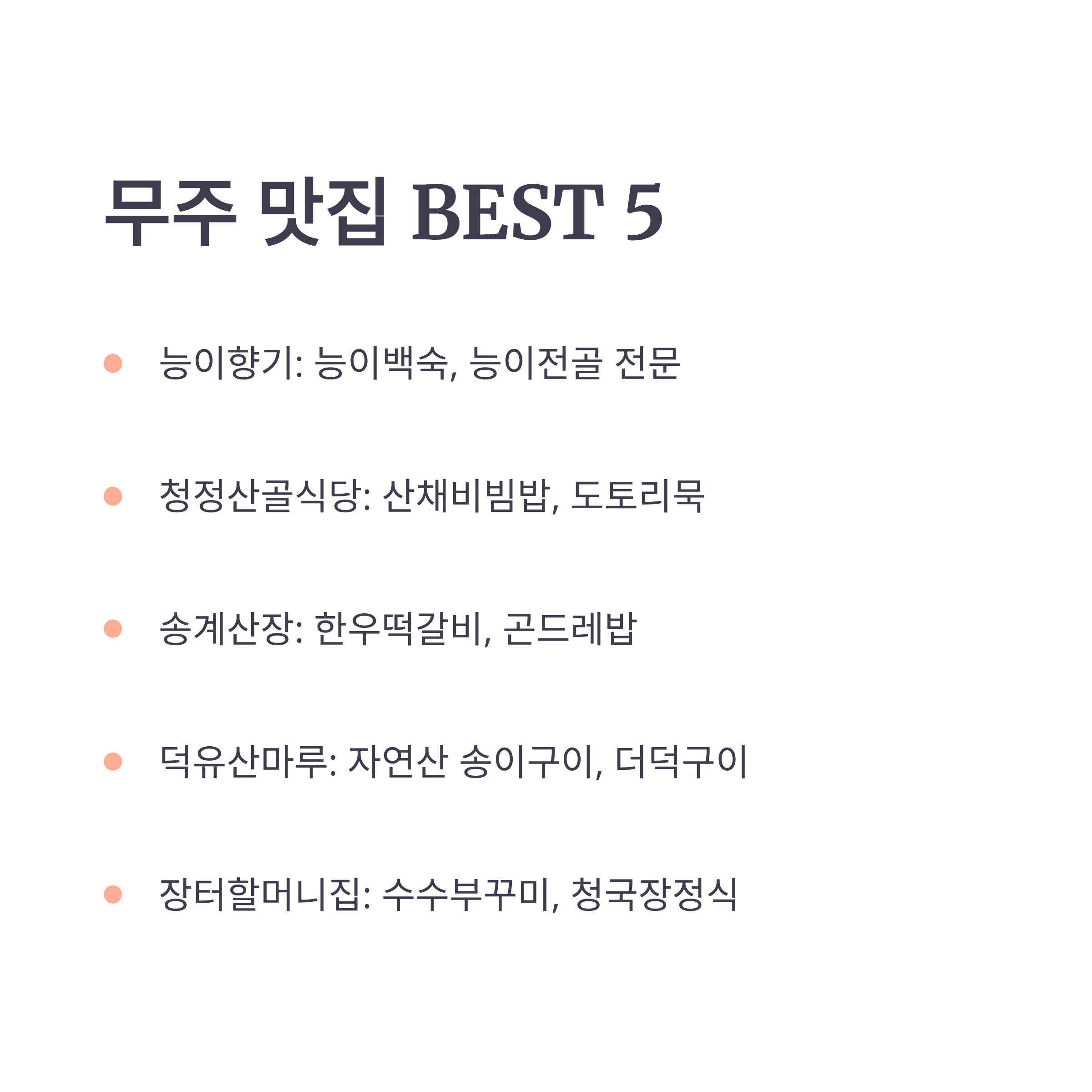 무주 지역에서 현지인과 관광객 모두 만족한 맛집 5곳을 소개드립니다.식당명 주소 주요 메뉴 특징