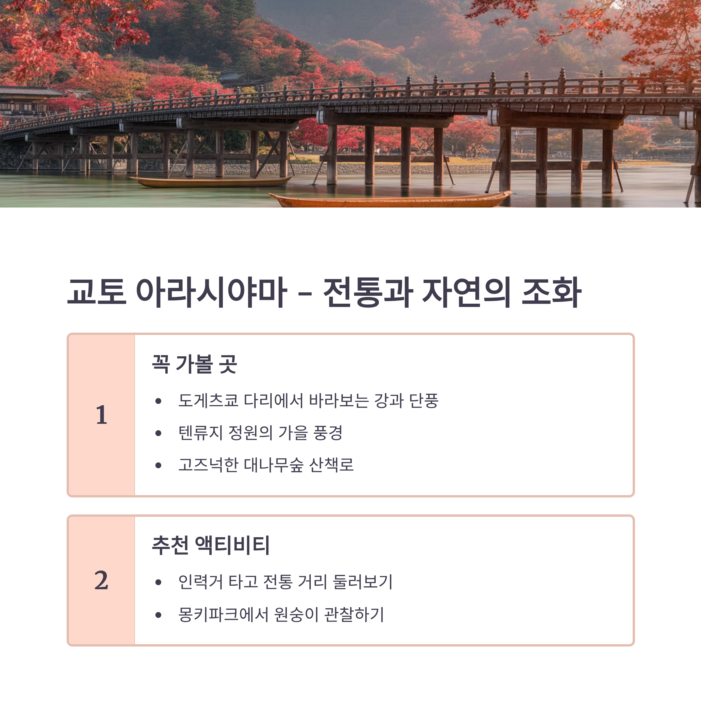 단풍 명소로 가장 먼저 떠오르는 곳이 바로 교토 아라시야마입니다. 한적한 산책길, 고즈넉한 사찰, 대나무숲과 붉게 물든 단풍이 어우러진 이곳은 매해 가을마다 수많은 여행자들의 발걸음을 끕니다.