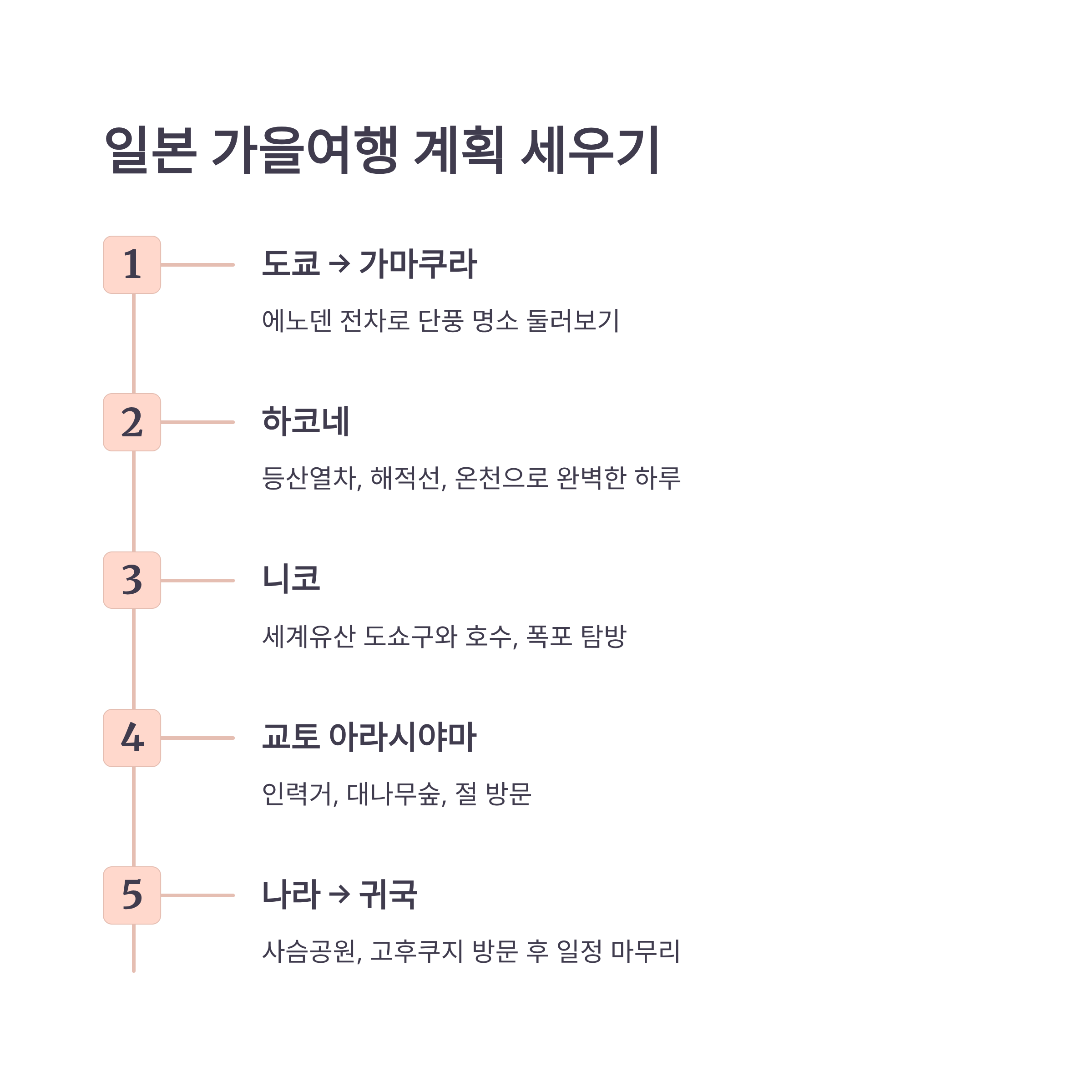 교토 아라시야마 전통과 자연이 조화된 단풍 명소 인력거, 사찰 산책 11월 초~중순 니코 세계유산과 호수, 폭포로 둘러싼 단풍 트레킹, 유람선 10월 중~11월 초 하코네 온천+단풍+후지산 조망 등산열차, 온천 11월 중순 가마쿠라 조용한 절 중심의 도보 산책 고토쿠인, 전차 타기 11월 초~중순 쿠로베 협곡열차 기차 안에서 즐기는 협곡 단풍 풍경 협곡열차, 온천 10월 초~중순 나라 고후쿠지 사슴과 함께하는 단풍 사슴먹이주기, 공원산책 11월 초~중순