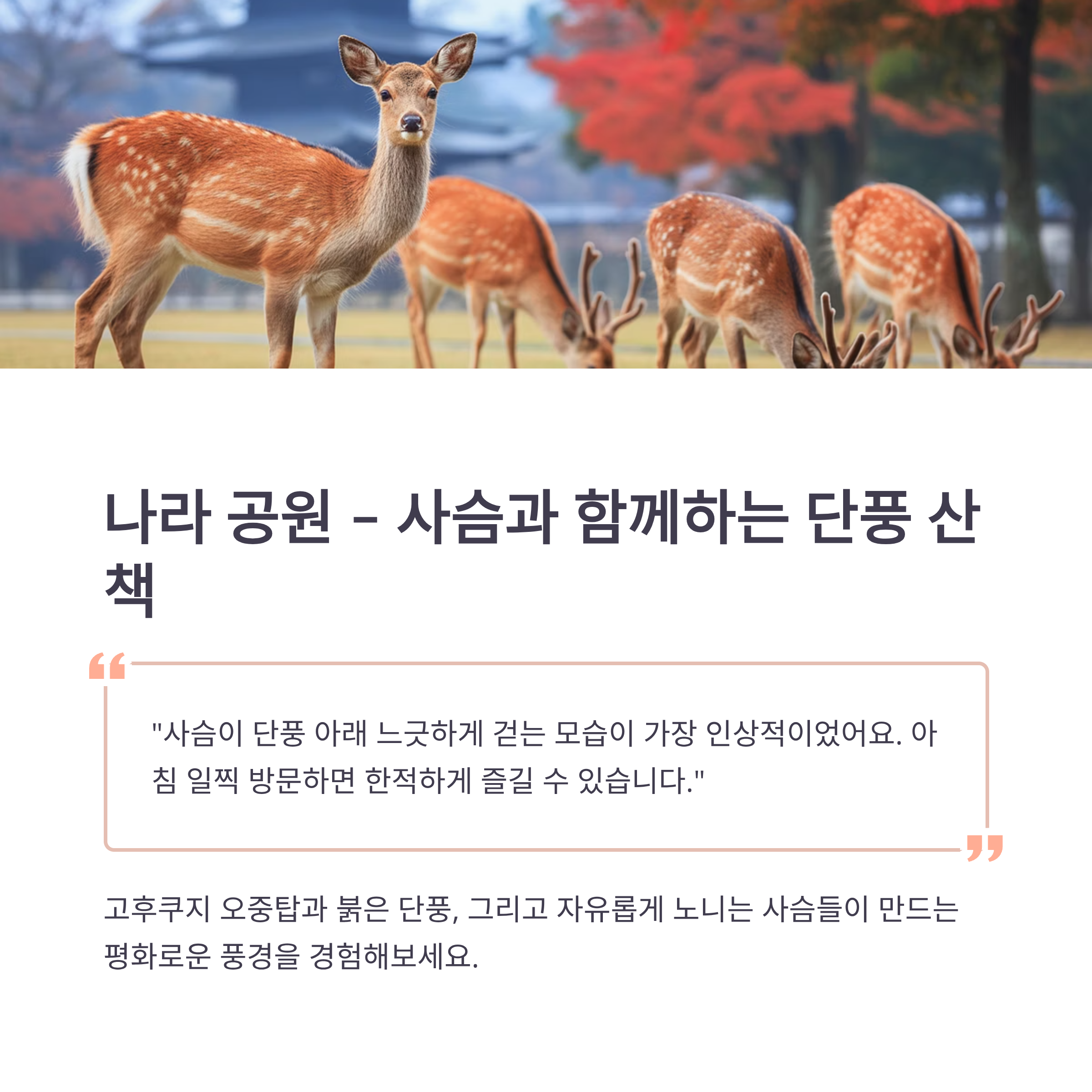 "사슴이 단풍 아래에서 느긋하게 걷고 있는 모습이 정말 사랑스러웠어요. 아침에 일찍 가면 한적하게 즐길 수 있어서 좋습니다."