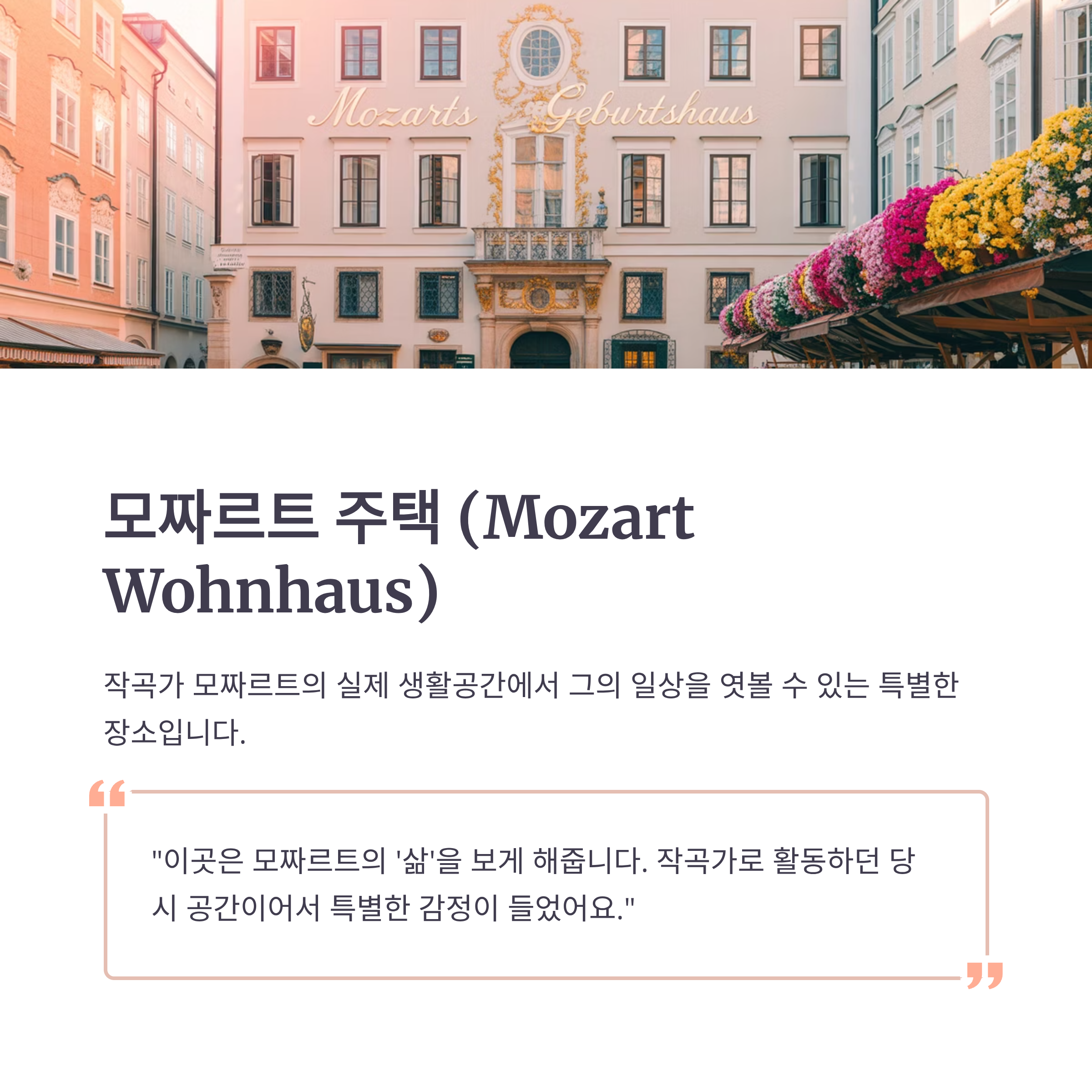 주소 Makartplatz 8, 5020 Salzburg, Austria 특징 1773년 이후 모차르트 가족이 거주한 집 즐길거리 작곡실 복원 공간 관람, 영상 다큐 감상, 기념관 스토어 포토스팟 건물 전면 유리창, 복원된 거실, 피아노 앞 체험후기 “이곳은 모차르트의 ‘삶’을 보게 해줍니다. 작곡가로 활동하던 당시 공간이어서 특별한 감정이 들었어요.” 생가와는 달리 이곳은 넓고 조용한 분위기입니다. 당시의 작곡 환경과 생활이 잘 보존되어 있어, 모차르트의 창작과 일상에 더욱 가까이 다가갈 수 있는 장소입니다.