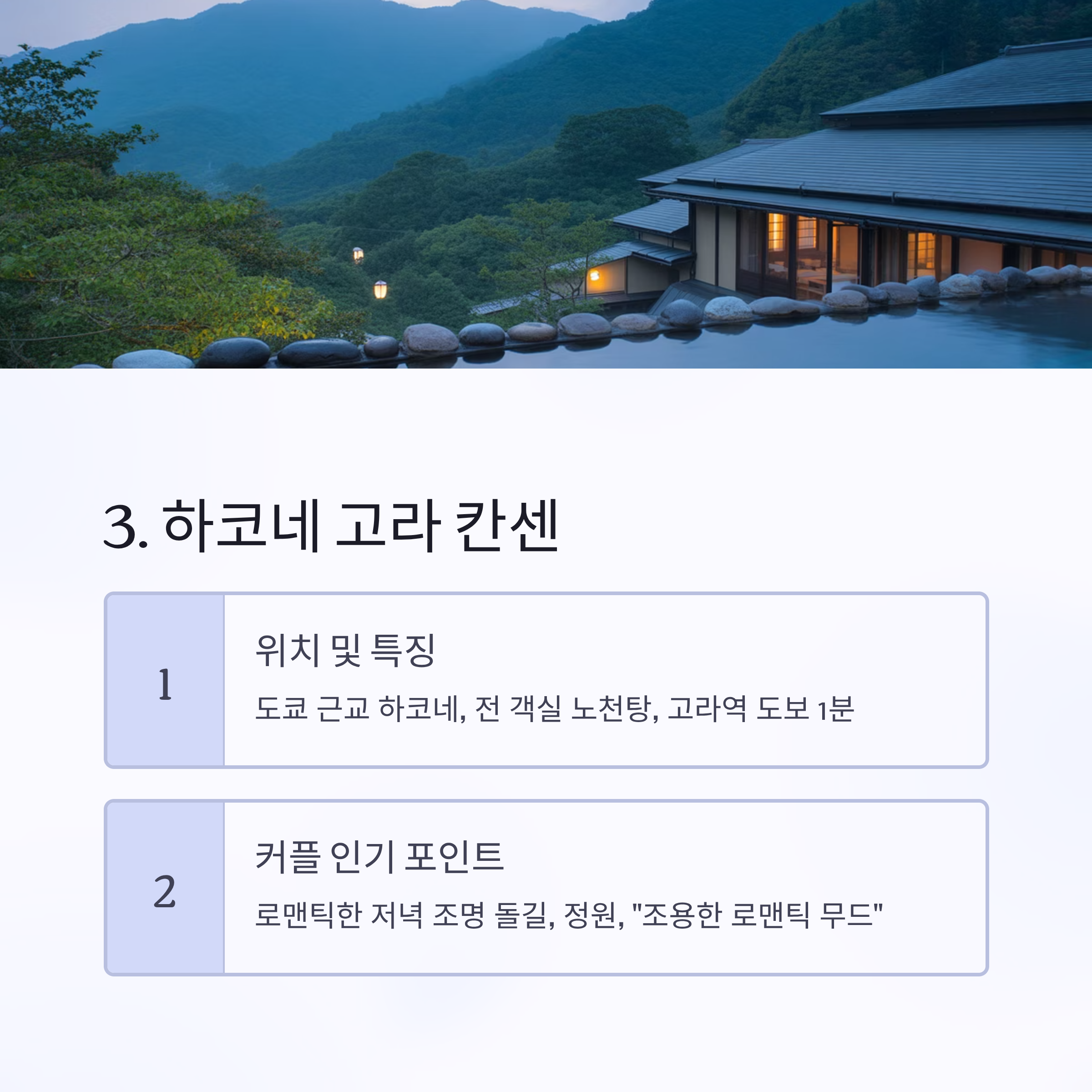 하코네는 도쿄 근교 대표 온천 지역으로, 이 료칸은 일본 현지에서도 커플 여행객의 필수 코스로 꼽힙니다. 전 객실에 노천탕이 설치되어 있으며, 고라 역에서 도보 1분 거리로 접근성도 탁월합니다.