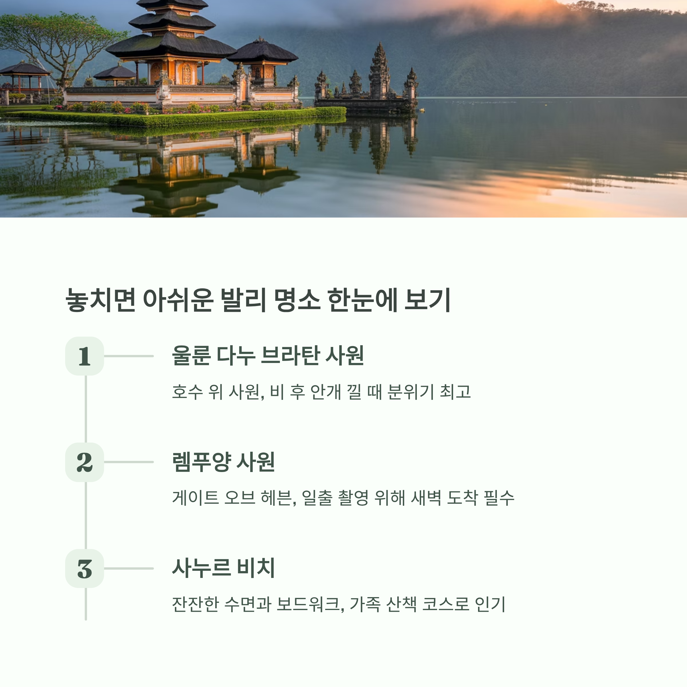 울룬 다누 브라탄 사원 Candikuning, Baturiti, Tabanan 호수 위 사원, 안개무드 보트 포토, 산책 렘푸양 사원 Bunutan, Abang, Karangasem 게이트 오브 헤븐 일출 촬영, 사원 참배 사누르 비치 Sanur, Denpasar 잔잔한 수면, 보드워크 자전거, 일출 산책 체험후기 요약