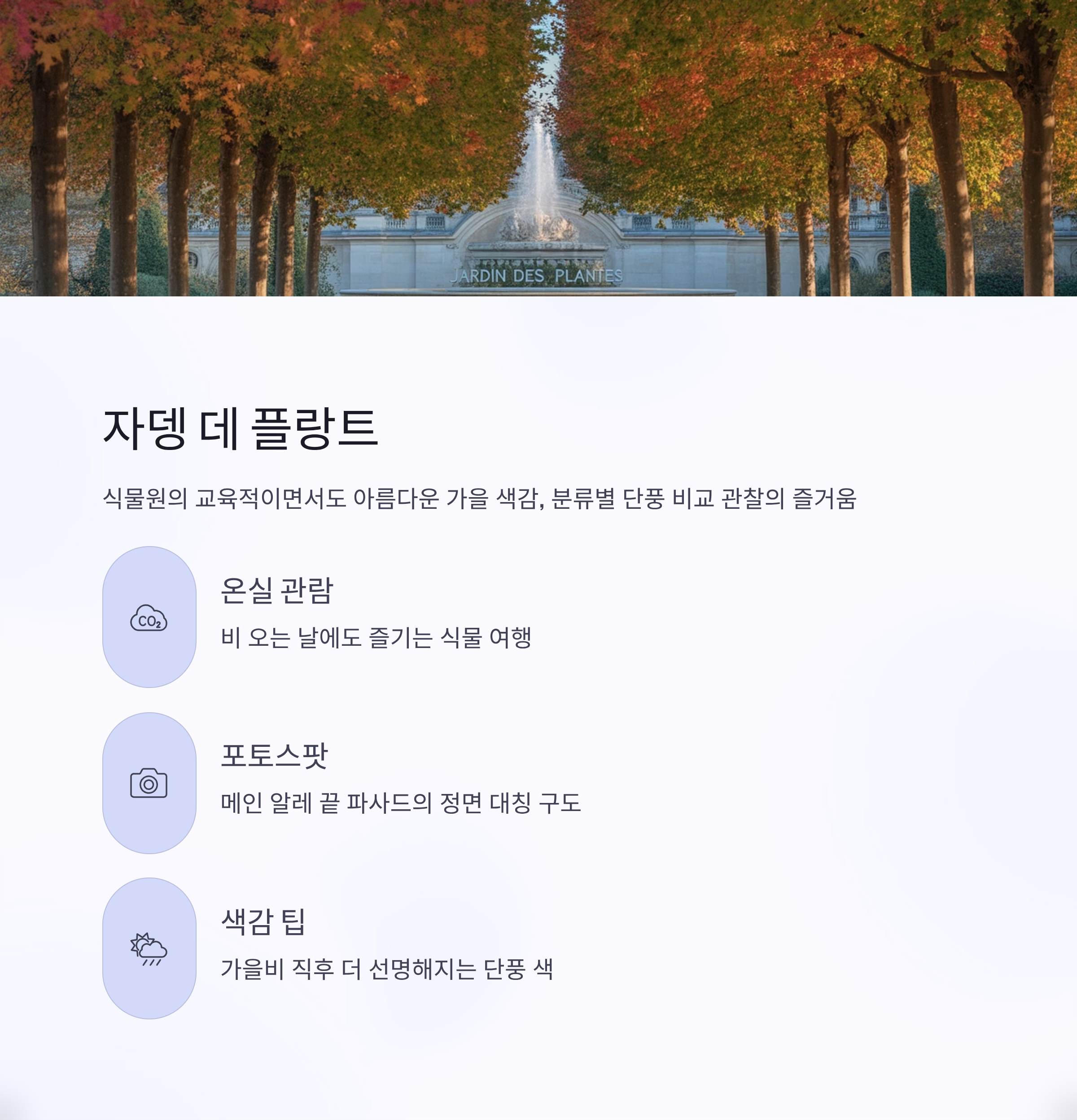 도심 정원과 외곽 숲을 균형 있게 넣으면 만족도가 높습니다.