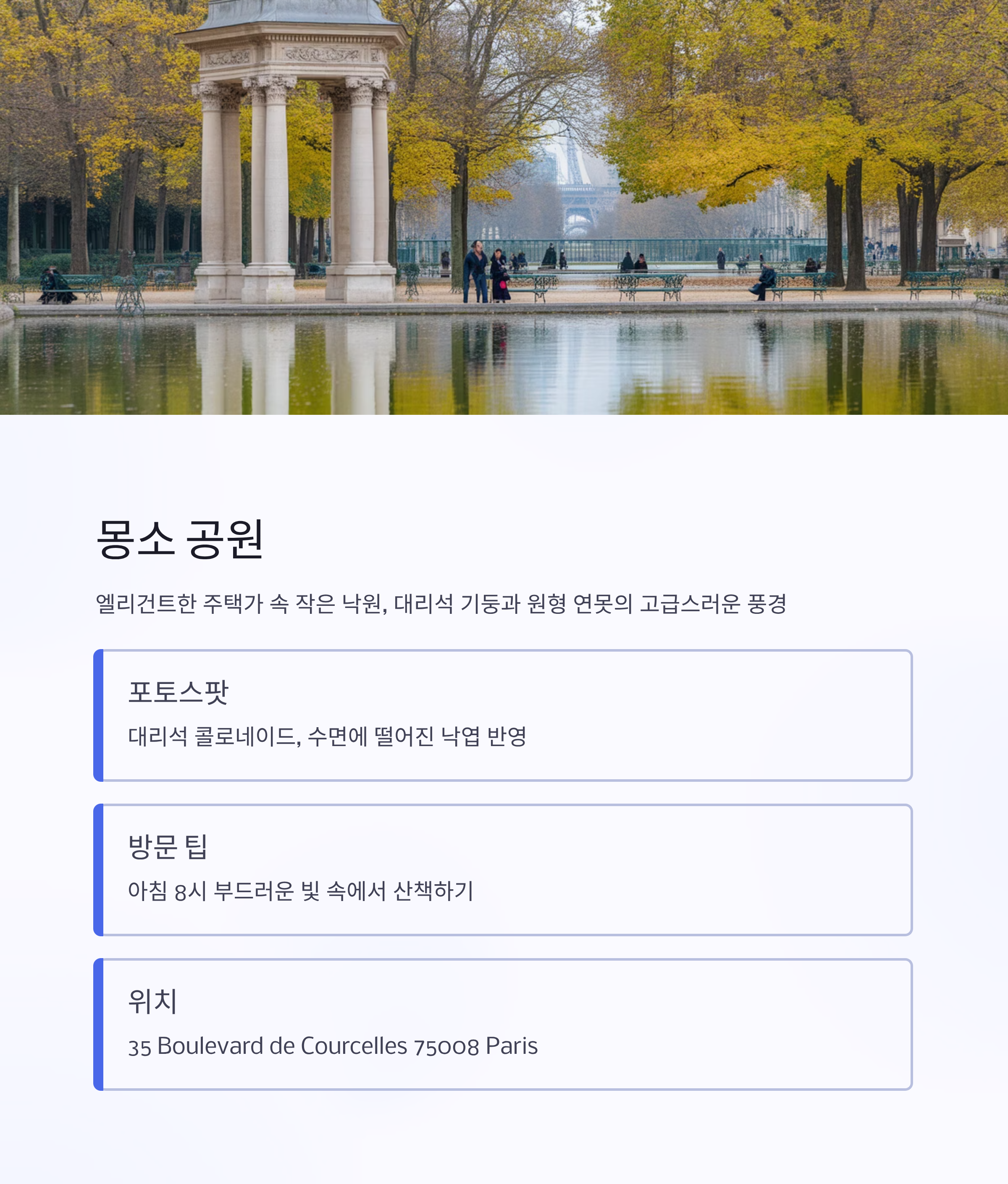 튈르리 정원 오전 이른 시간 중간 Tuileries Concorde 뤽상부르 공원 오후 늦은 햇살 중간 Luxembourg RER 부트쇼몽 공원 노을 직전 낮음 Botzaris ButtesChaumont 몽소 공원 아침 시간 낮음 Monceau 불로뉴 숲 오후 산책 낮음 Porte Dauphine 뱅센느 숲 주말 한낮 낮음 Château de Vincennes 페르 라셰즈 안개 낀 오전 낮음 Philippe Auguste 쿨레 베르트 오전 산책 중간 Bastille Gare de Lyon 자뎅 데 플랑트 맑은 한낮 중간 Gare d Austerlitz 몽마르트르 오전 골목 높음 Abbesses Anvers 포토스팟 좌표 메모와 촬영 아이디어