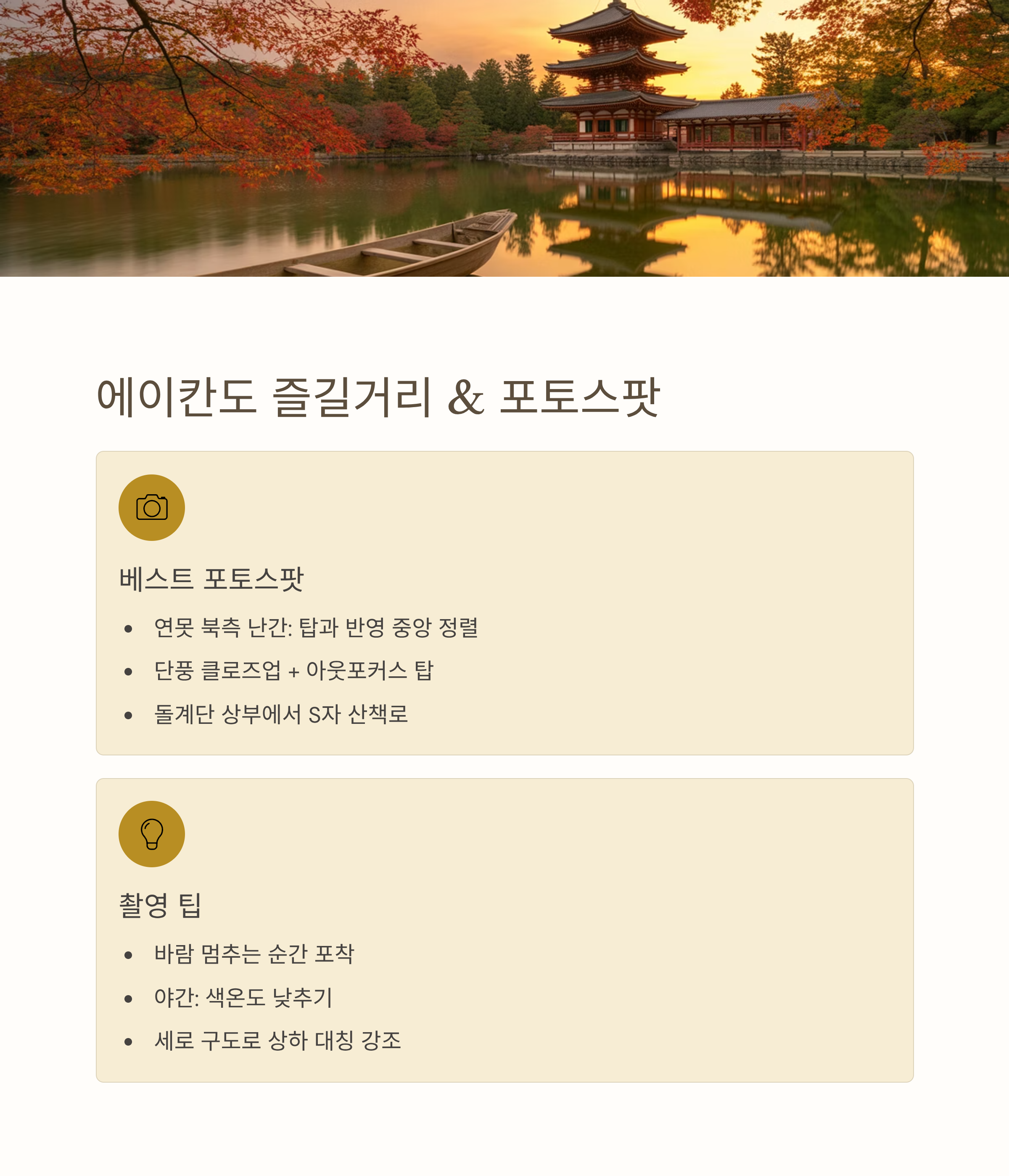 풍경 결 물 반영과 탑의 서정성 다리와 계곡의 입체감 최성기 경향 11월 중하순 밤 풍경 강세 11월 중하순 낮 전경 강세 혼잡 체감 야간 집중, 동선 분산 양호 오전 집중, 대기 가능성 큼 촬영 포인트 연못 난간, 탑 실루엣, 대칭 츠텐쿄, 하단 회랑, 정원 패턴 날씨 변수 비, 무풍일에 강점 맑음, 약한 바람에 강점 결론적으로 낮의 드라마는 도후쿠지, 밤의 서정은 에이칸도입니다.