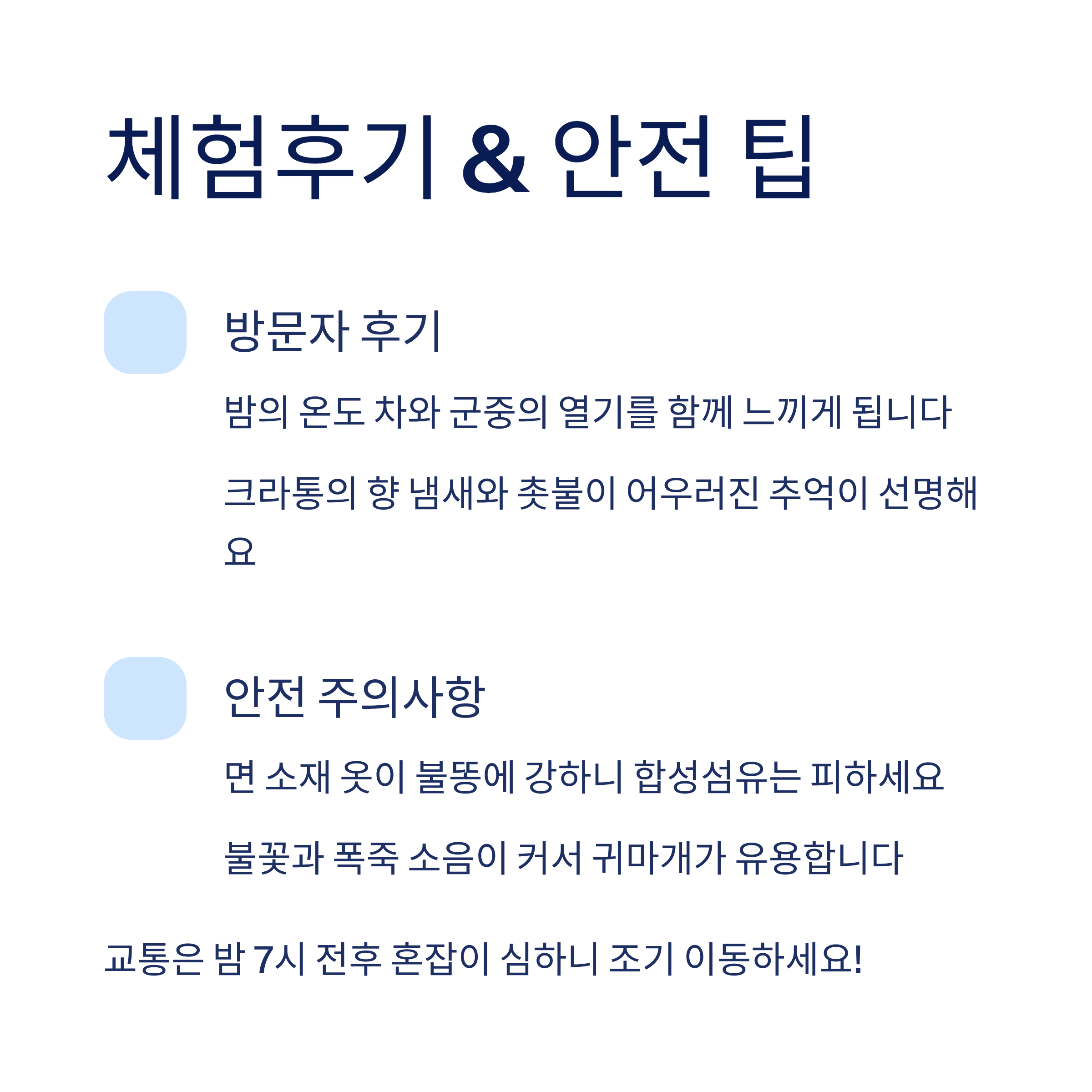 면 소재 옷이 불똥에 강하니 합성섬유는 피하는 편이 낫습니다.우천 시엔 하늘 랜턴이 취소될 수 있어 대안이 필요합니다.