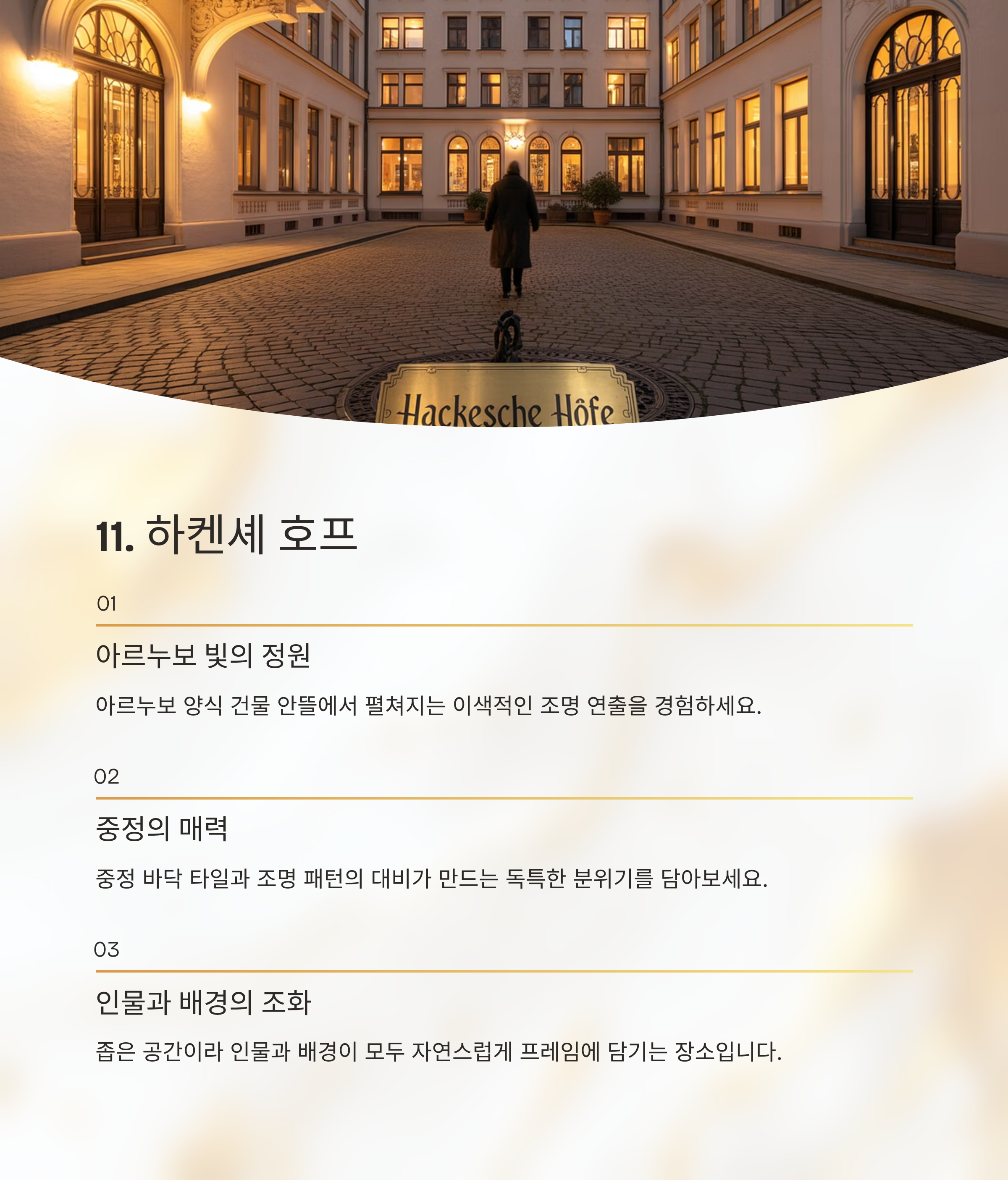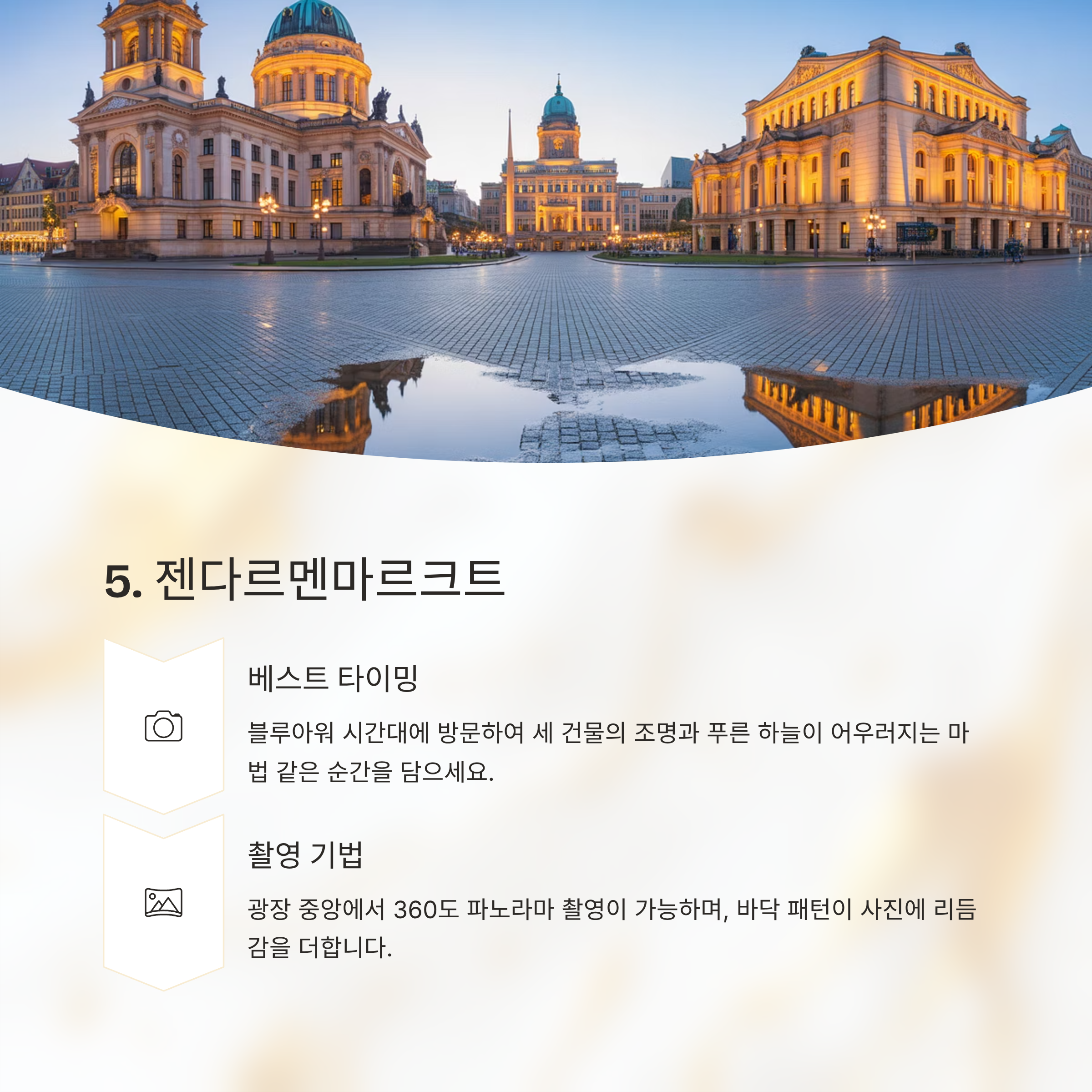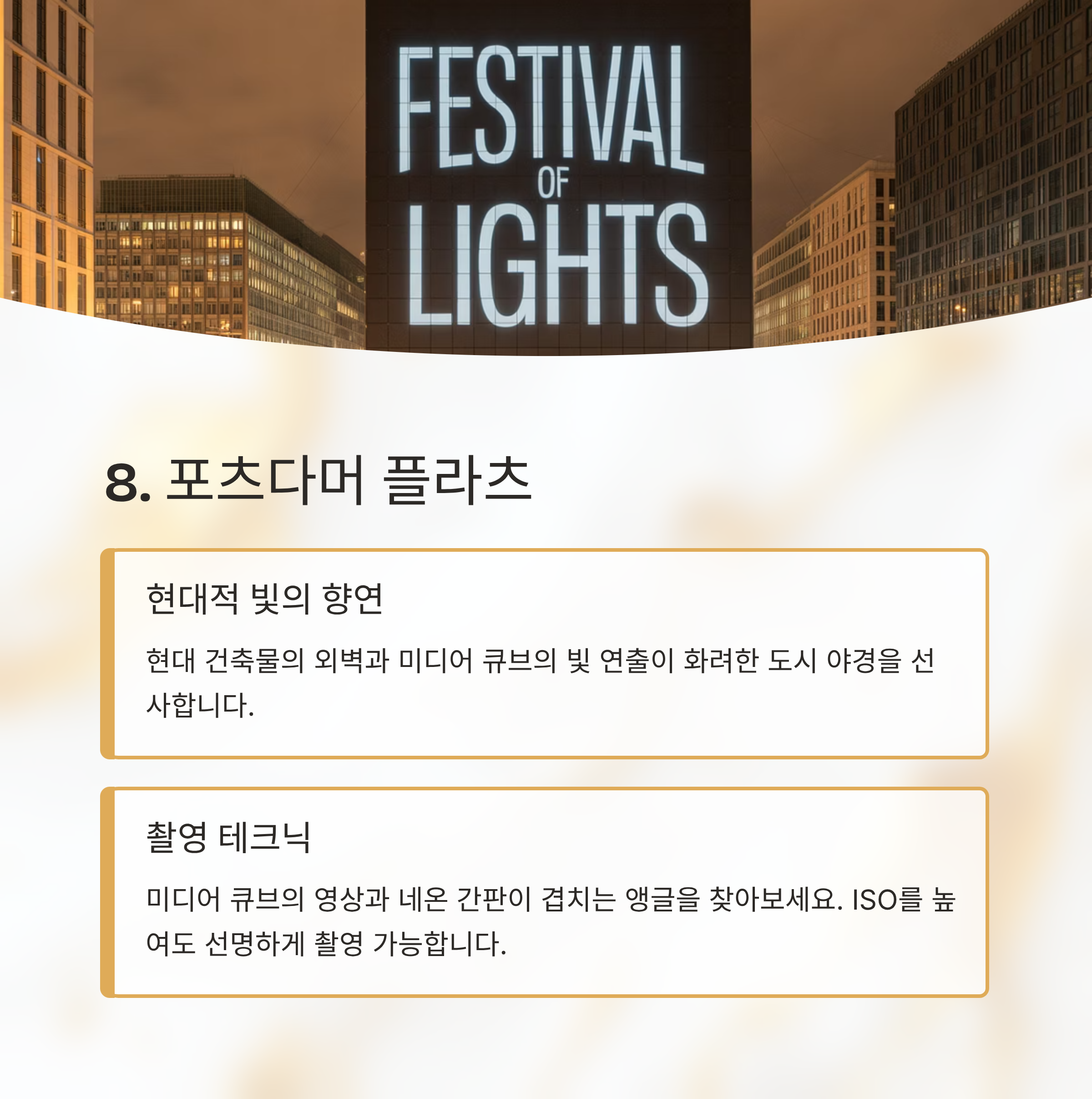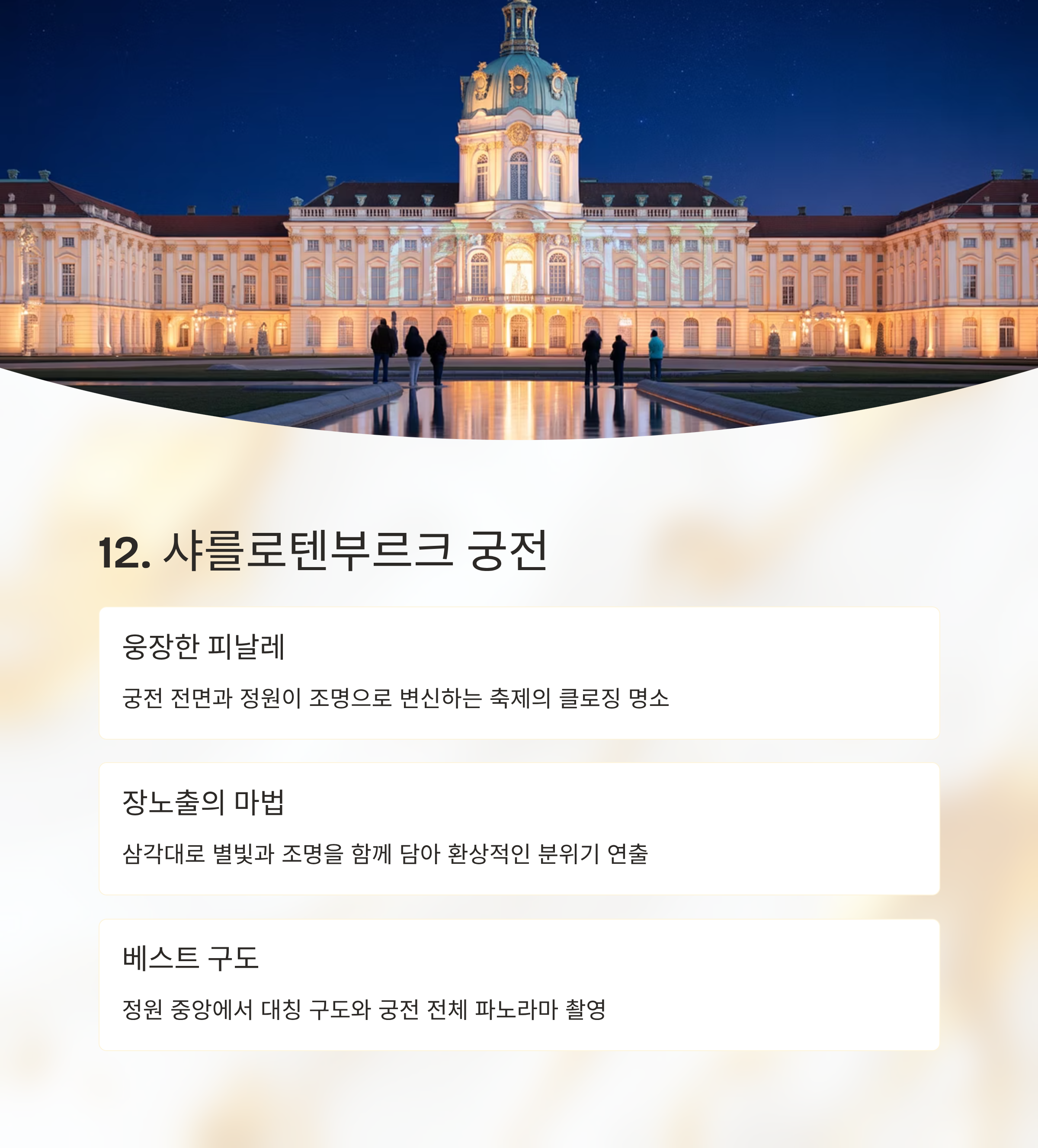 18:30 샤를로텐부르크 궁전 해질 무렵 도착, 오렌지~파랑 하늘 19:30 브란덴부르크 문 메인 매핑 관람, 인파 주의 20:00 라이히스타크 의사당 돔 뷰포인트 포함 20:30 베를린 대성당 & 훔볼트 포럼 강변 반사샷 21:00 젠다르멘마르크트 3건물 파노라마 21:30 TV 타워 & 알렉산더플라츠 네온과 매핑 조합 22:00 포츠다머 플라츠 현대 건축 야경 22:30 중앙역 유리 외벽 조명과 기차 진입샷 빛의 축제는 빠르게 이동하기보다 한 포인트에서 빛 패턴이 바뀌는 순간을 기다리는 것이 좋습니다.
