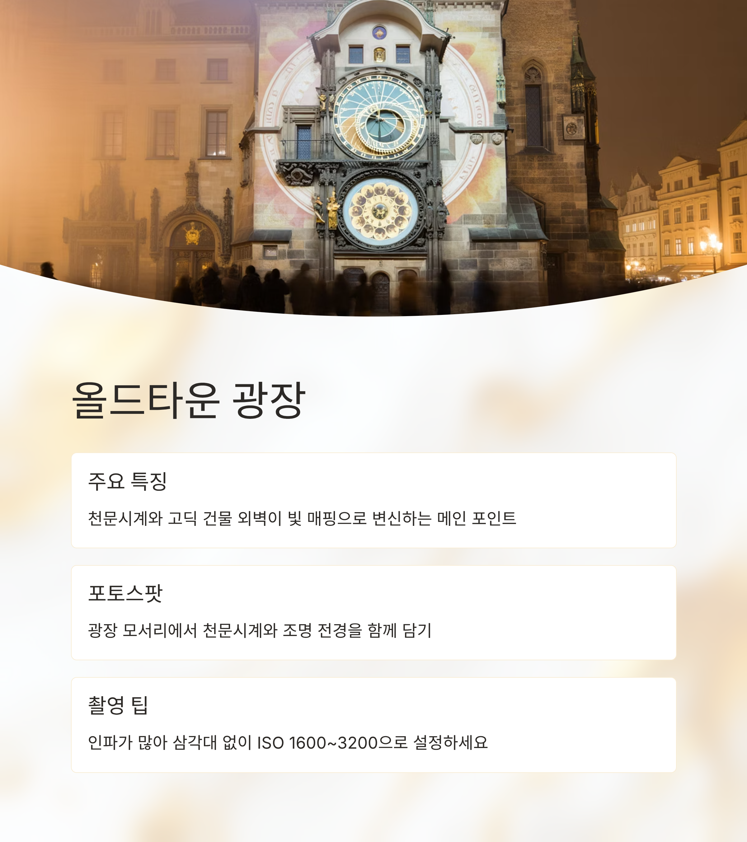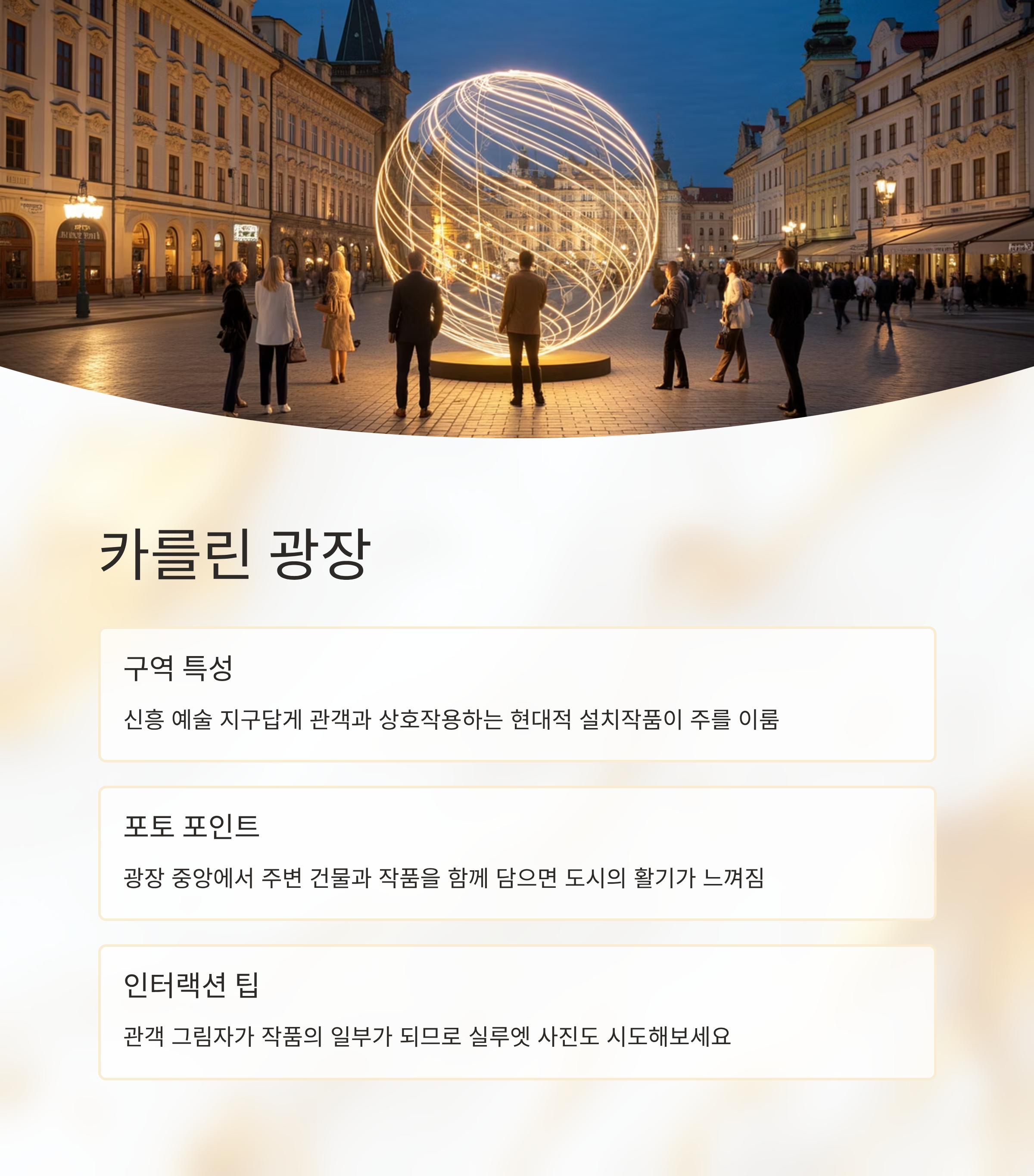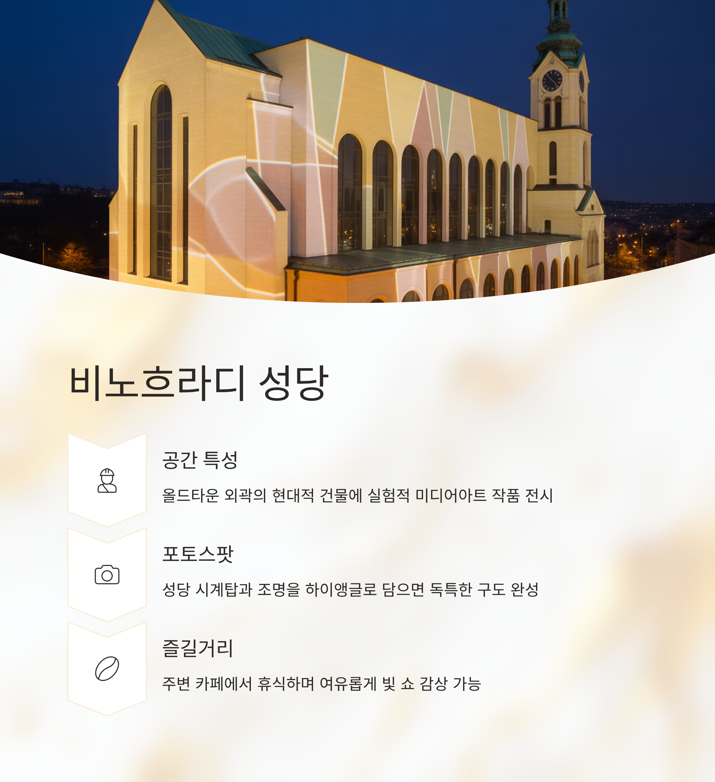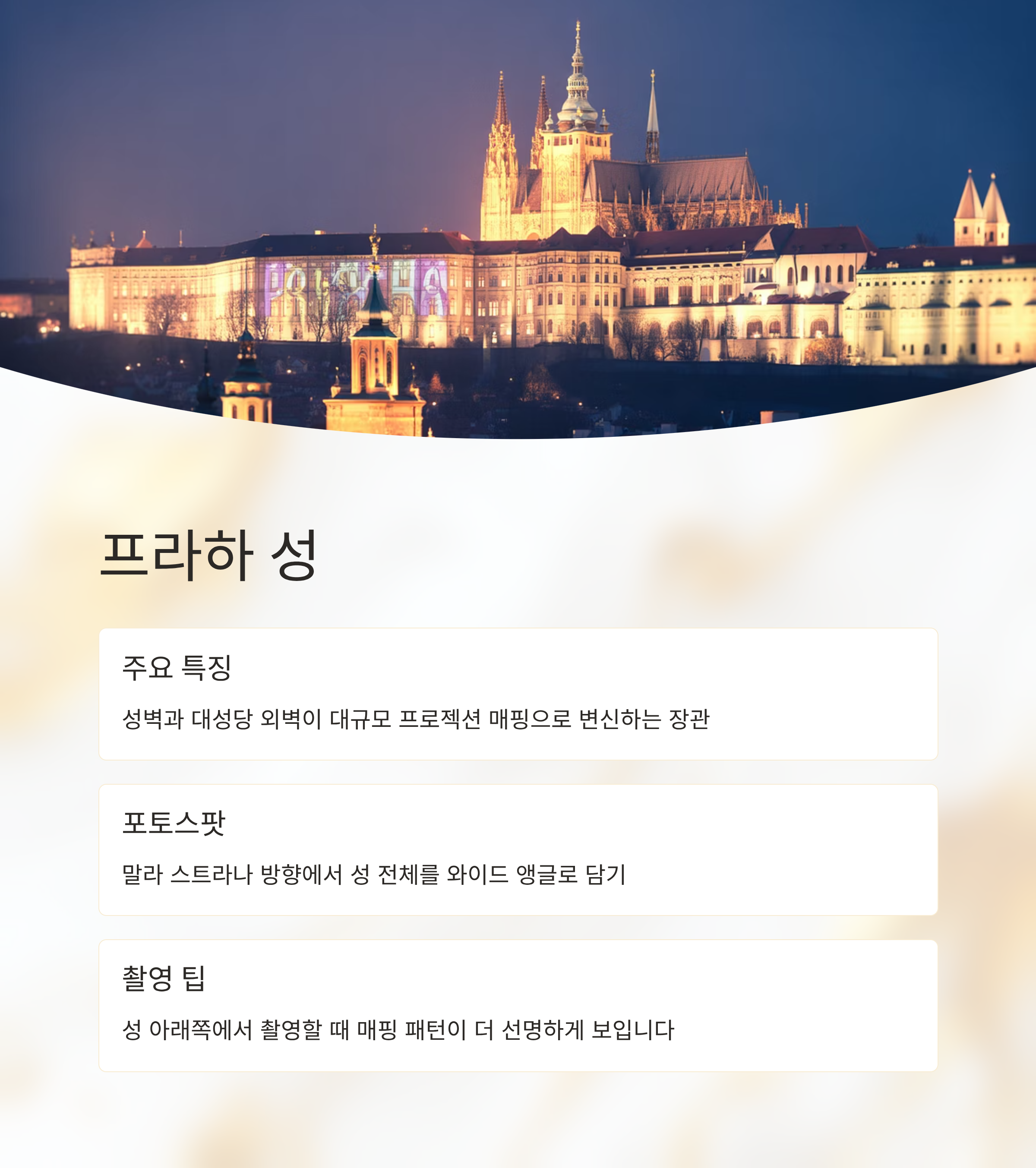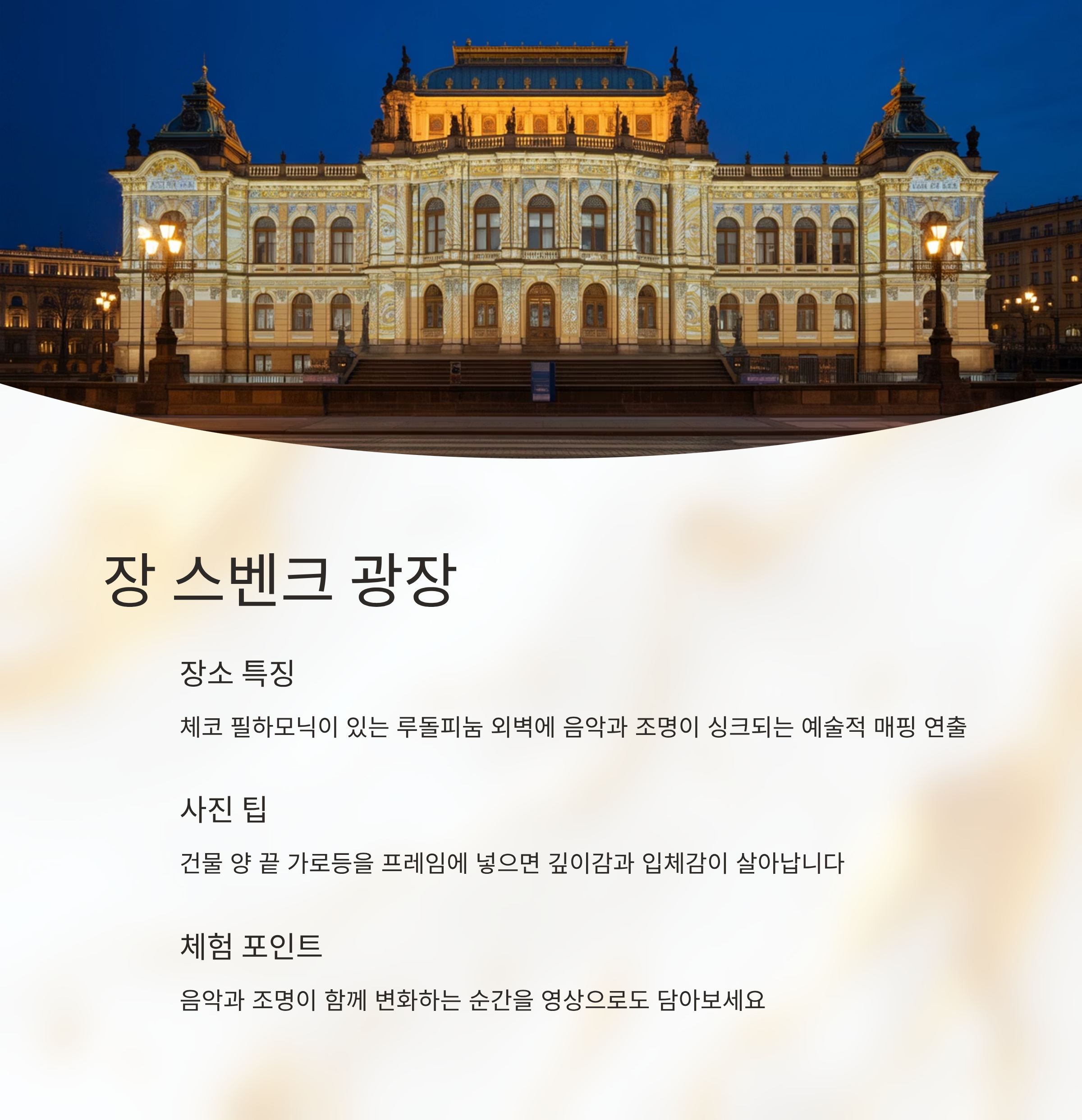 19:00 올드타운 광장 천문시계·틴 성당 매핑 19:40 카를교 프라하 성 방향 촬영 20:20 프라하 성 말라 스트라나 경유 21:00 말라 스트라나 광장 성 니콜라스 교회 21:40 클레멘티눔 중정 매핑 22:10 장 스벤크 광장 루돌피눔 조명 22:40 국립극장 강변 반사샷 23:10 비노흐라디 성당 또는 카를린 광장 외곽 스폿 마무리 시그널 페스티벌은 작품과 관객이 함께 완성하는 축제입니다.