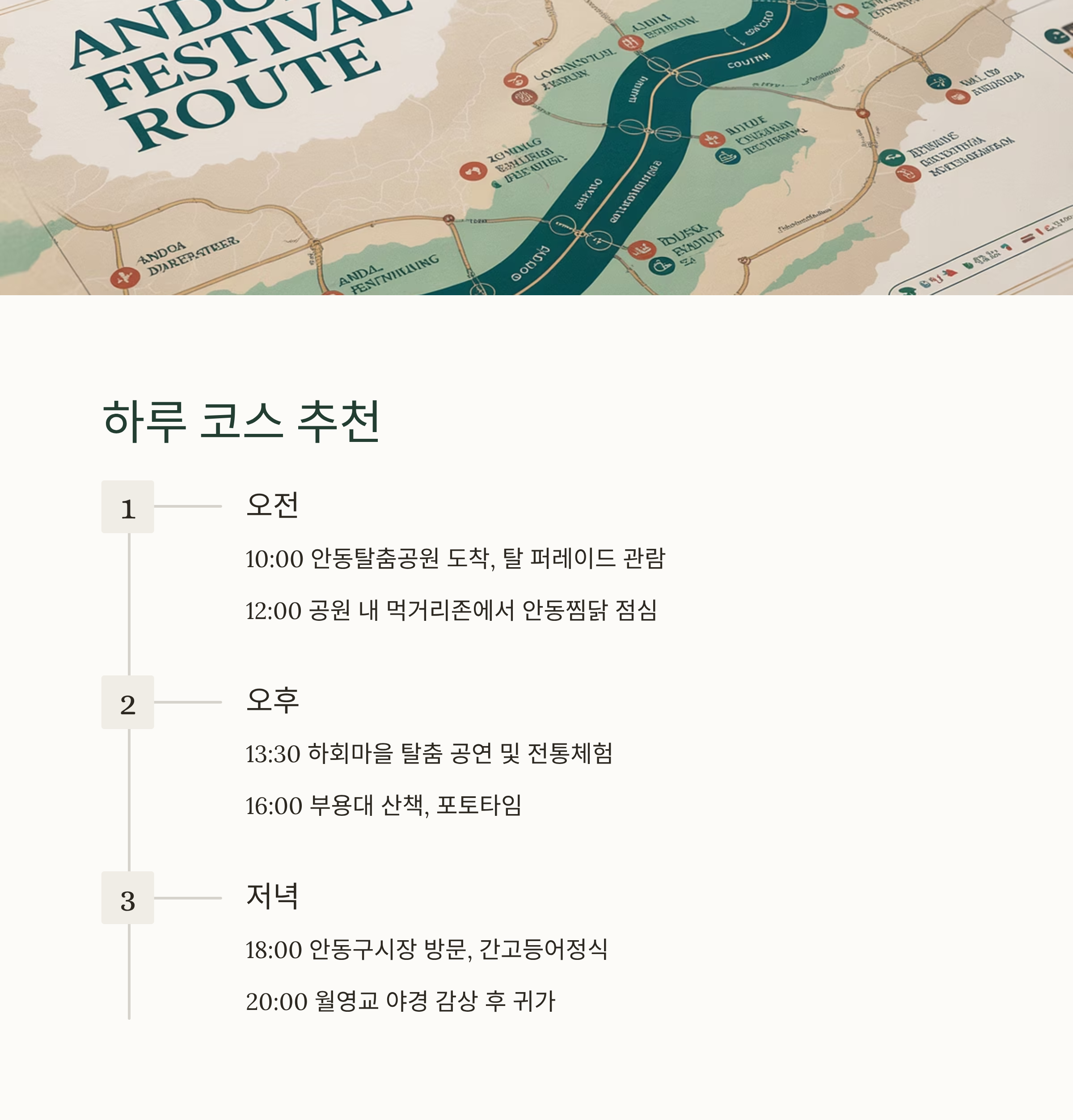 10:00 안동탈춤공원 도착, 탈 퍼레이드 관람 12:00 공원 내 먹거리존에서 점심식사 (안동찜닭) 13:30 하회마을 이동, 탈춤 공연 및 전통체험 관람 16:00 부용대 산책, 포토타임 18:00 안동구시장 방문, 간고등어정식으로 저녁식사 20:00 월영교 야경 감상 후 귀가 .....