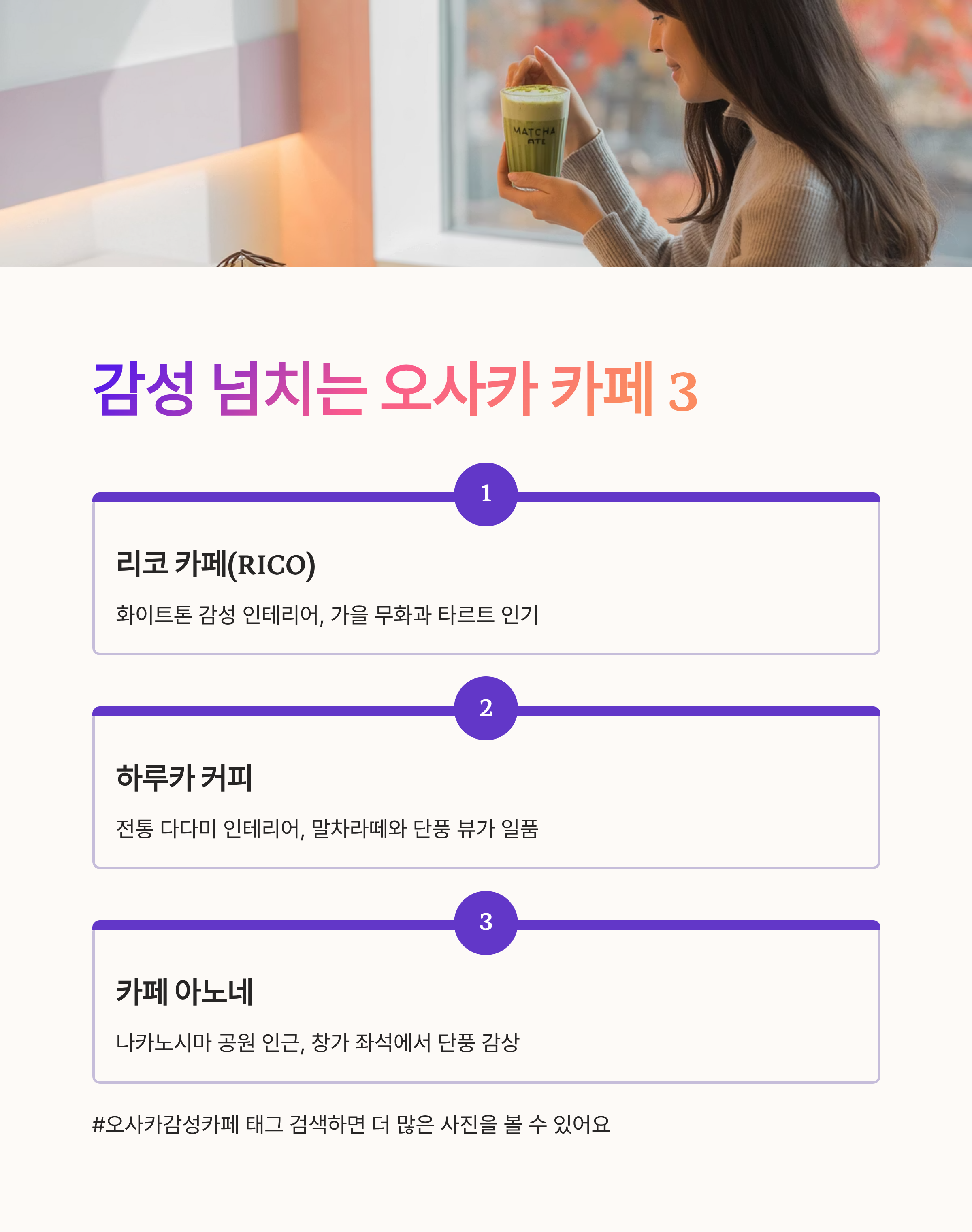 리코 카페(RICO) 오사카시 기타구 화이트톤 감성 인테리어, 가을엔 무화과 타르트 인기 하루카 커피 오사카시 주오구 전통 다다미 인테리어, 말차라떼와 단풍 뷰가 어울림 카페 아노네 나카노시마 공원 인근 벚꽃·단풍 계절 풍경 감상, 창가 좌석 추천, 사과케이크 유명 SNS에서는 이 세 곳 모두 ‘#오사카감성카페’로 수많은 후기와 사진이 올라오며,