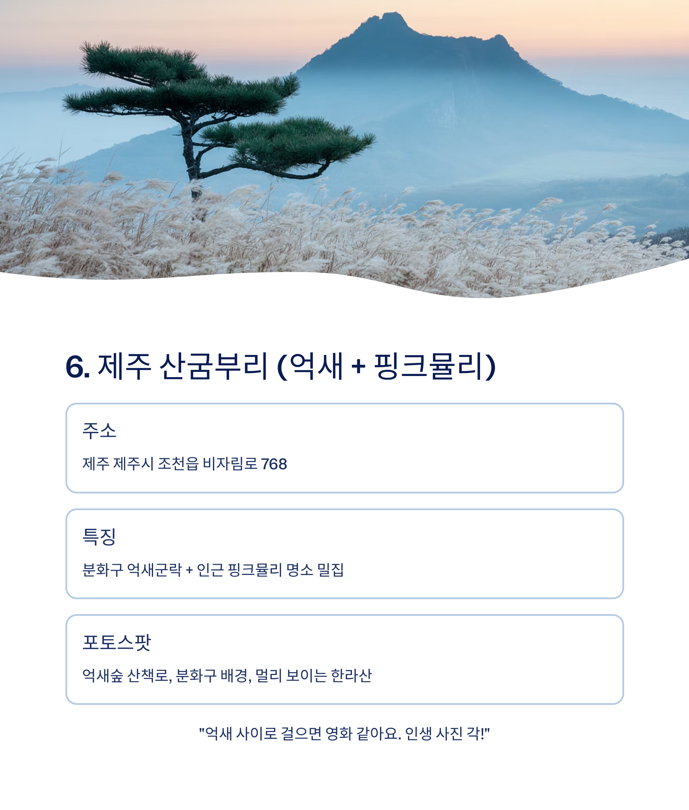 주소 제주 제주시 조천읍 비자림로 768 특징 분화구 억새군락 + 인근 핑크뮬리 명소 밀집 즐길거리 억새밭 산책, 산굼부리 분화구 관람, 근처 카페투어 포토스팟 억새숲 산책로, 분화구 배경, 멀리 보이는 한라산 라인 SNS 후기