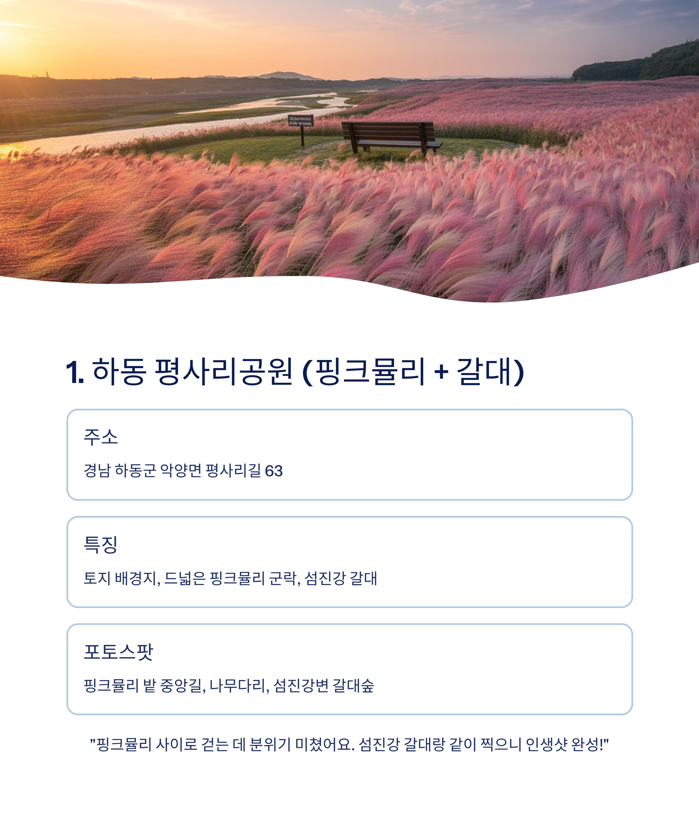 주소 경남 하동군 악양면 평사리길 63 특징 토지 배경지, 드넓은 핑크뮬리 군락, 섬진강 갈대 즐길거리 테마 포토존, 소설 '토지' 문학관 관람, 자전거 산책 포토스팟 핑크뮬리 밭 중앙길, 나무다리, 섬진강변 갈대숲 SNS 후기
