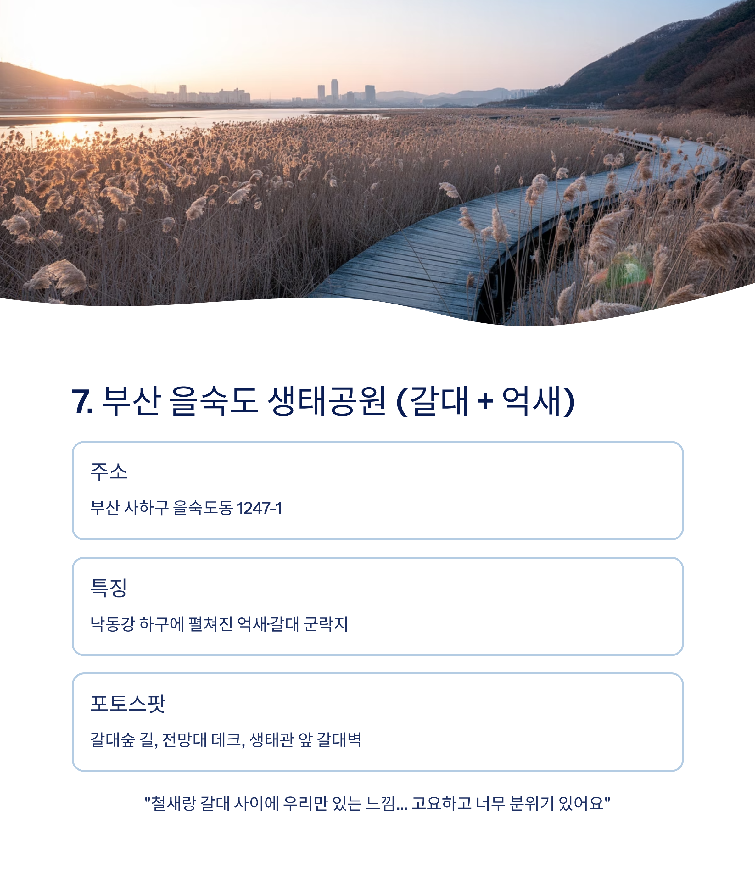 주소 부산 사하구 을숙도동 1247-1 특징 낙동강 하구에 펼쳐진 억새·갈대 군락지 즐길거리 생태탐방로 걷기, 철새 관찰, 자전거 포토스팟 갈대숲 길, 전망대 데크, 생태관 앞 갈대벽 SNS 후기