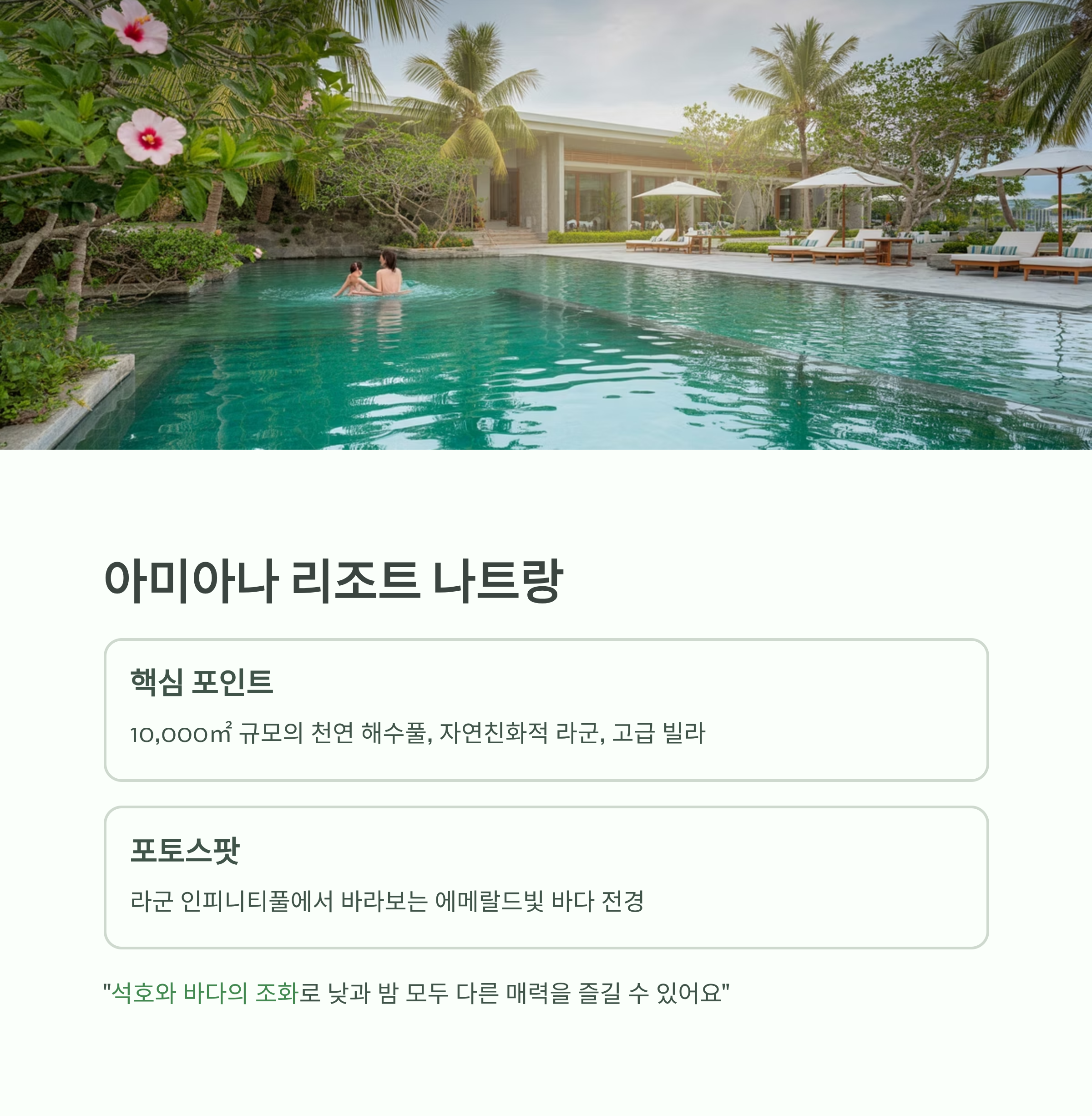 소개글: 대형 천연 해수풀과 자연 친화적 디자인으로 유명한 리조트입니다.