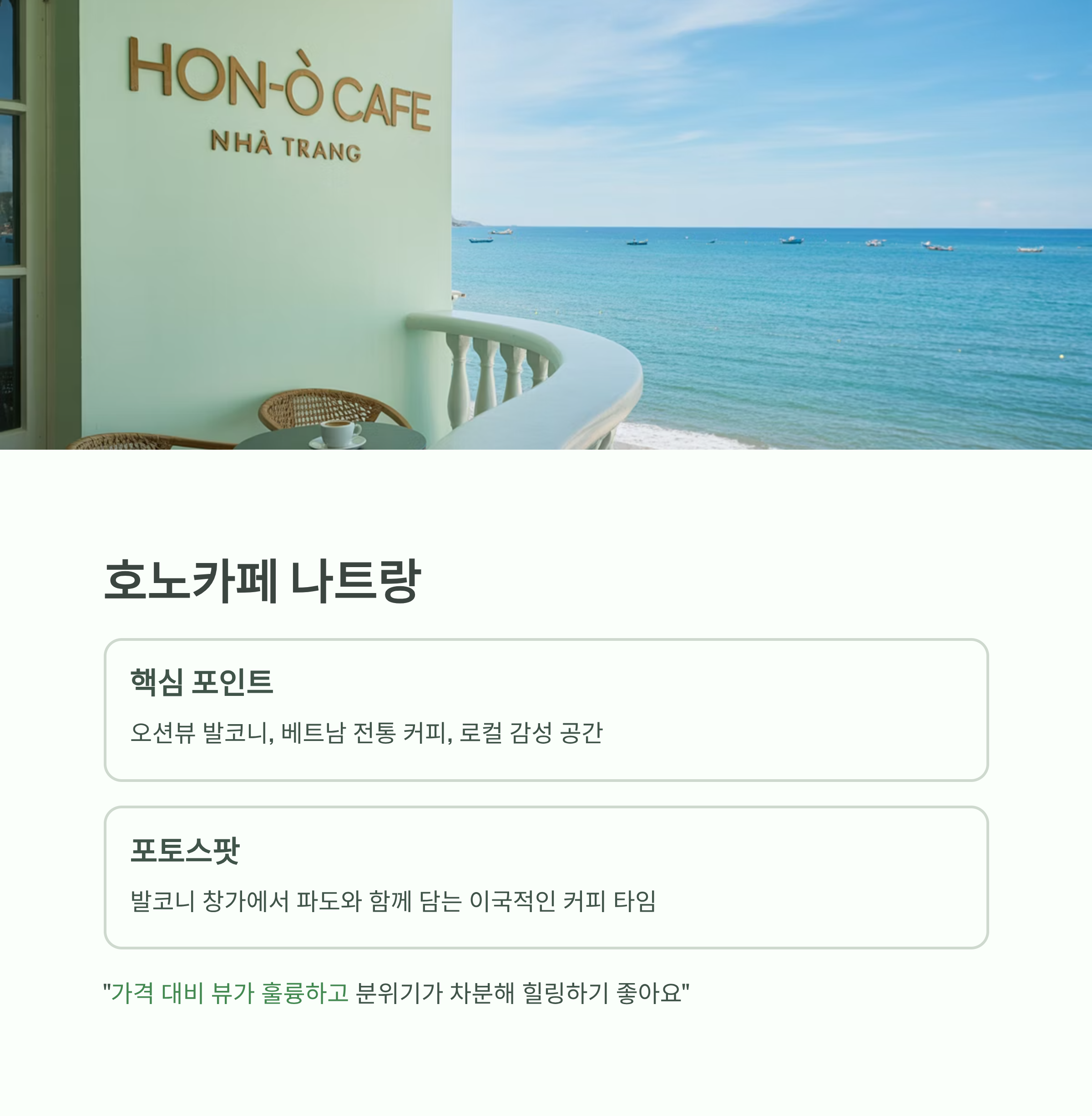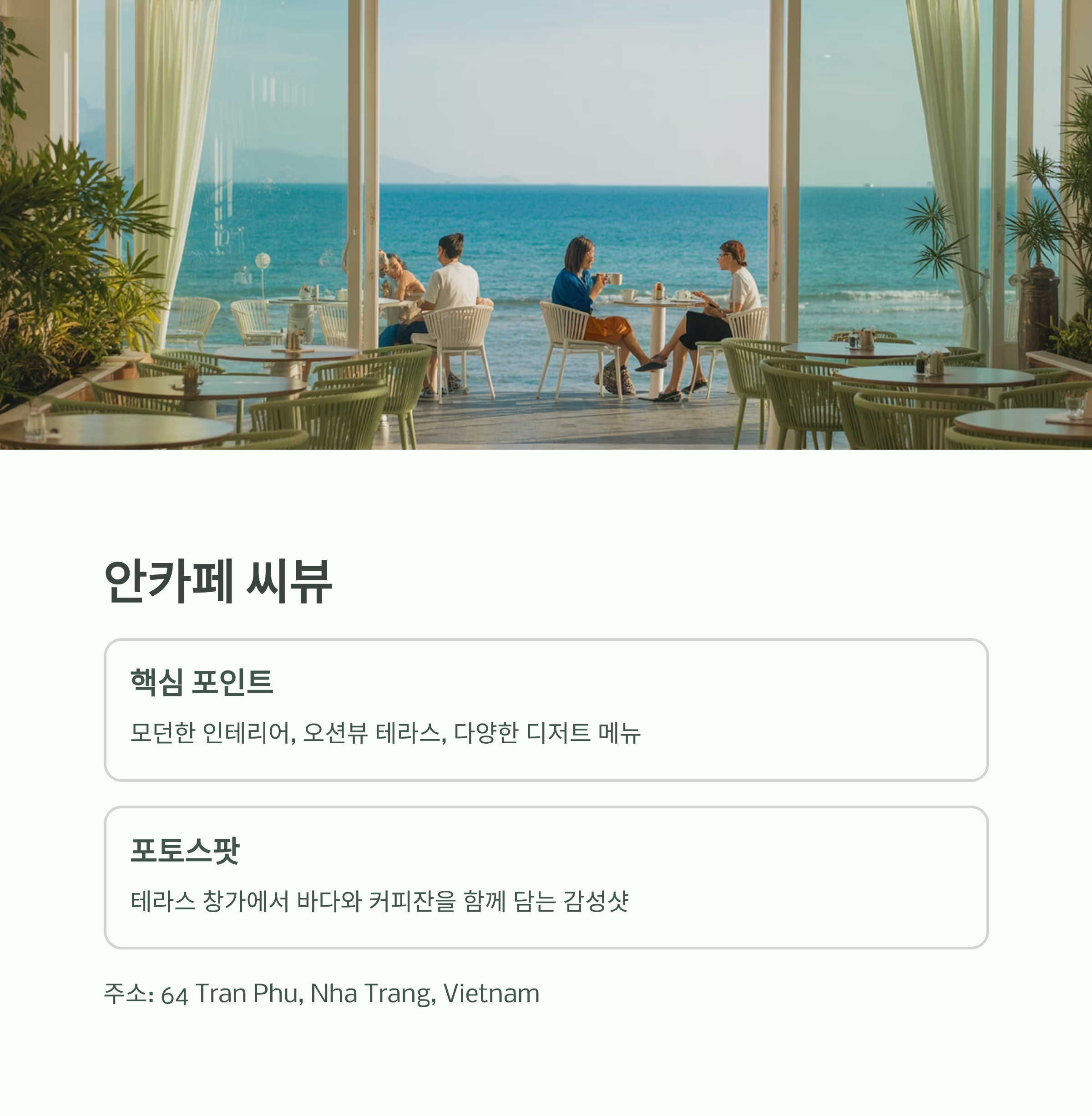 소개글: 나트랑 비치라인과 가까운 카페로, 로컬 감성과 세련된 인테리어가