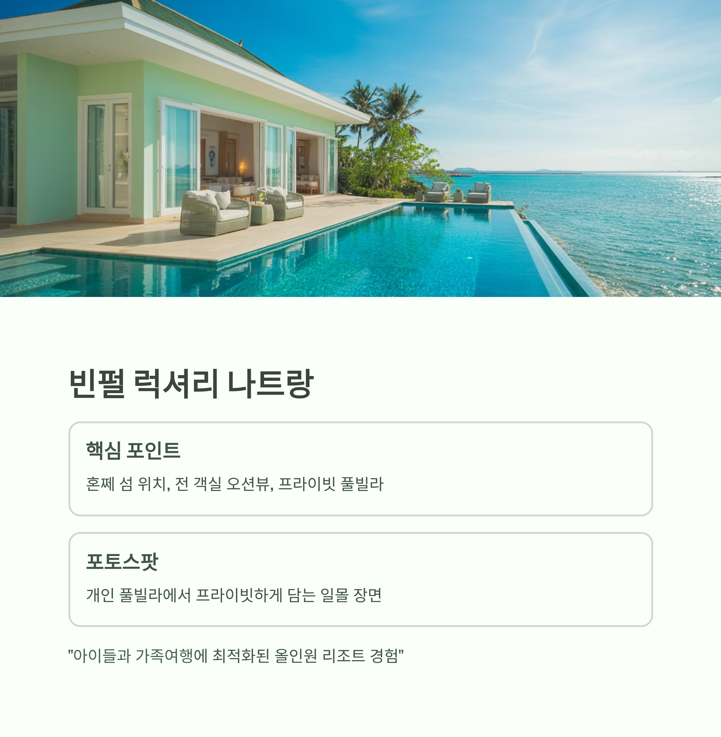 소개글: 혼쩨 섬에 위치한 독립형 리조트로 프라이빗 인피니티풀과
