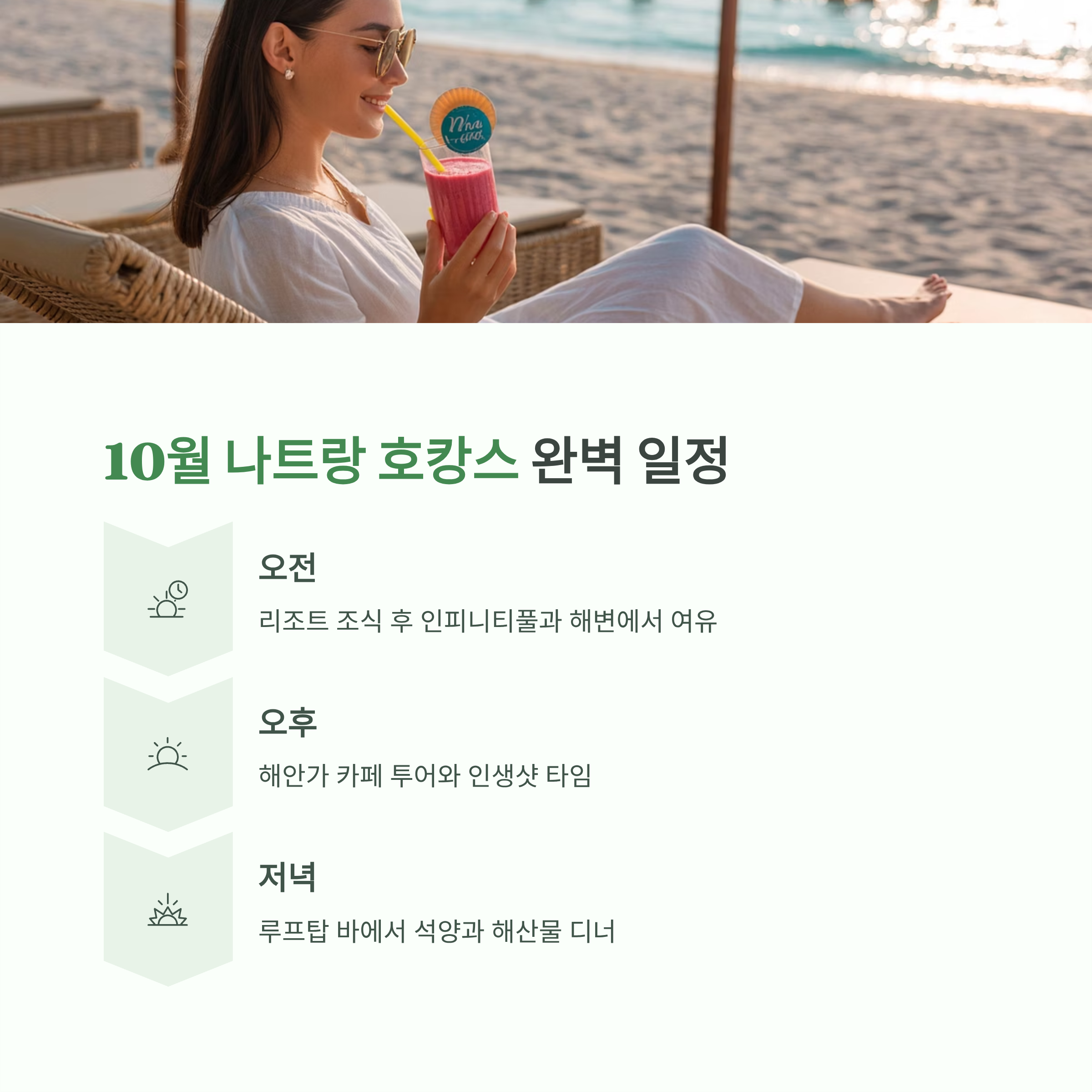 1일차 도착·체크인 리조트 인피니티풀 리조트 다이닝 2일차 해변 산책 안카페·호노카페 투어 스카이라이트 루프탑 3일차 아미아나 해수풀 체험 씨브리즈 카페 휴식 씨푸드 맛집 투어 4일차 빈펄 리조트 섬투어 풀사이드 브런치 귀국 준비 바다와 맞닿은 인피니티풀과 감성적인 카페에서 보내는 하루는